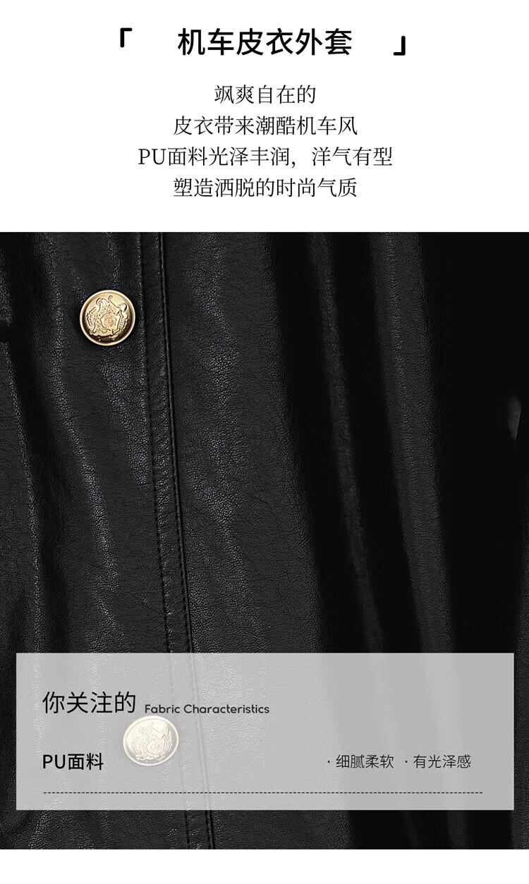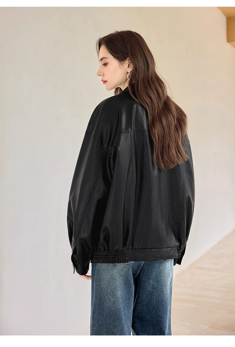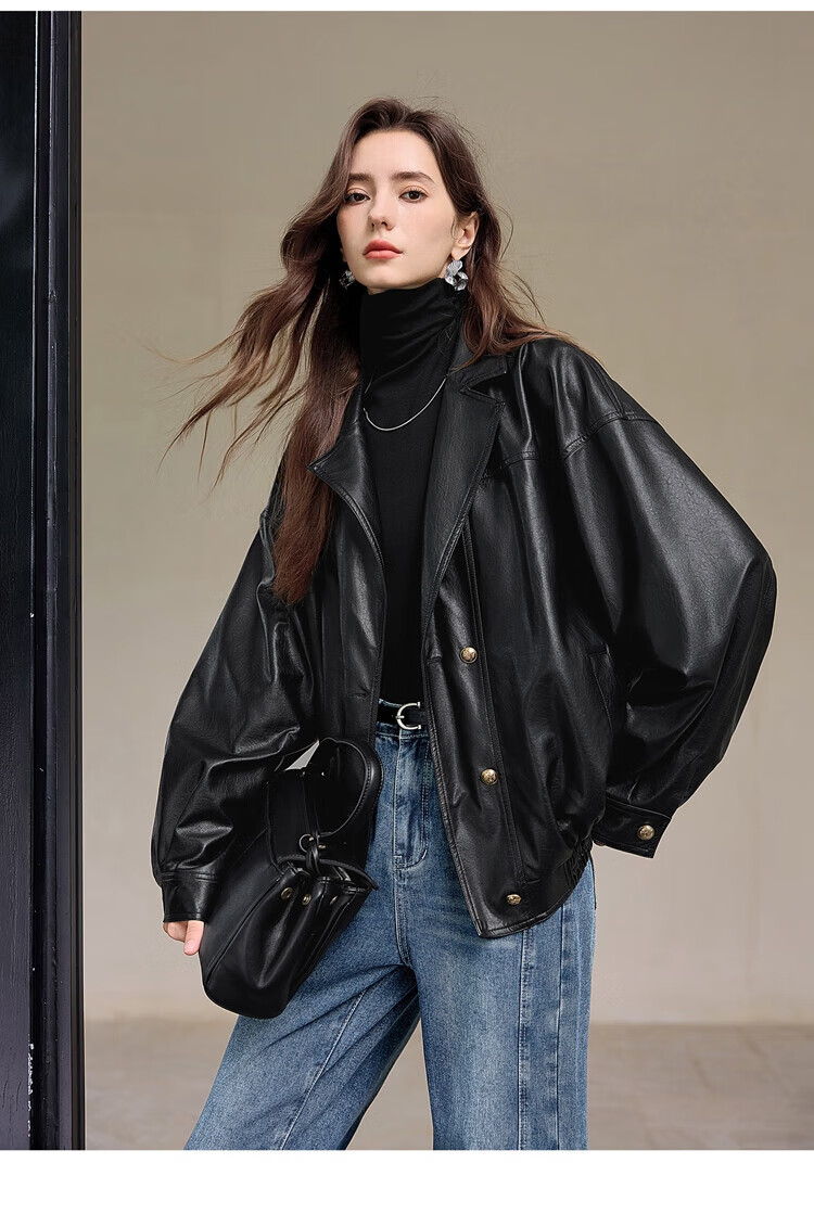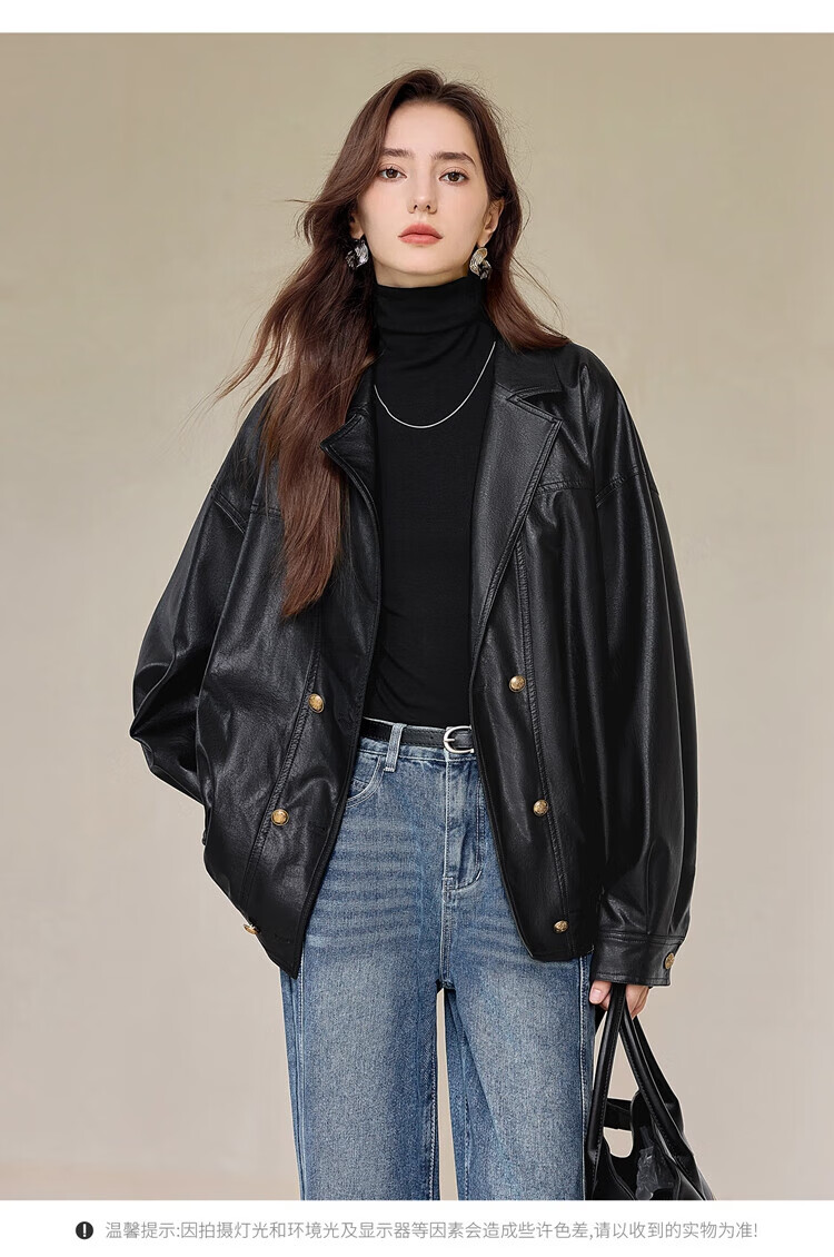 她池帅气PU皮机车夹克女2025秋装新款西装领宽松显瘦外套