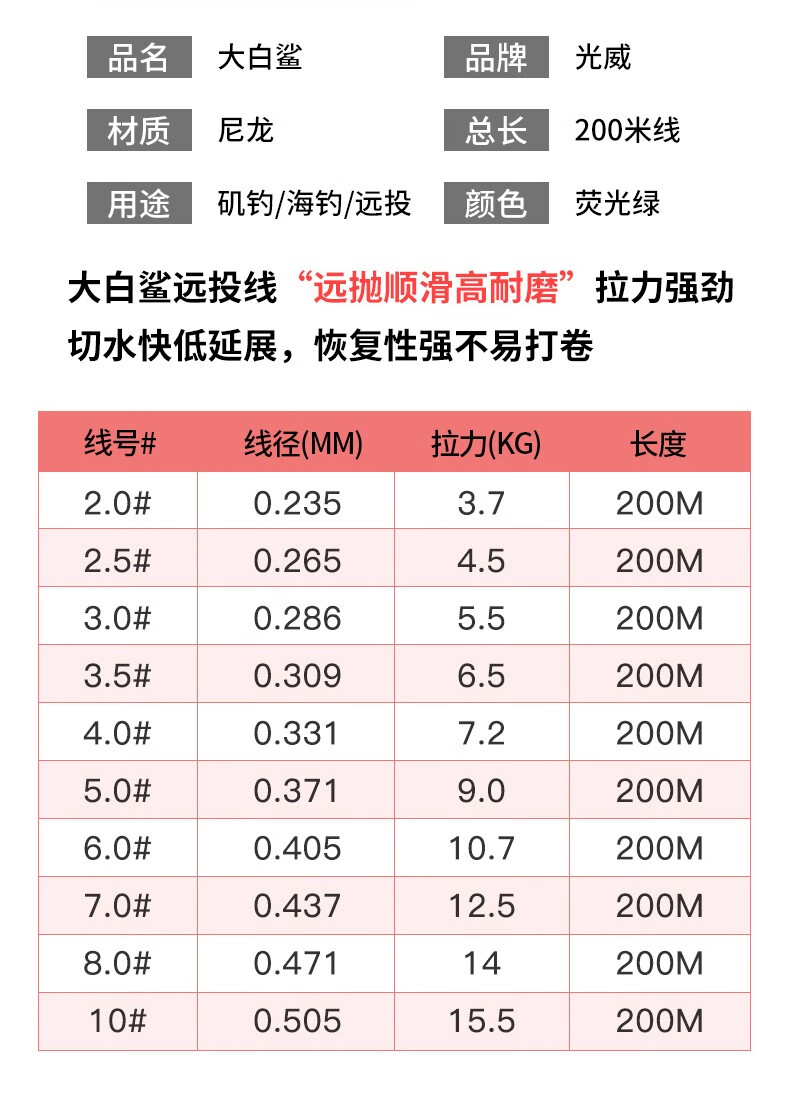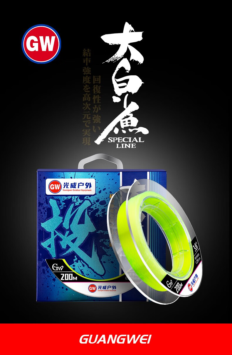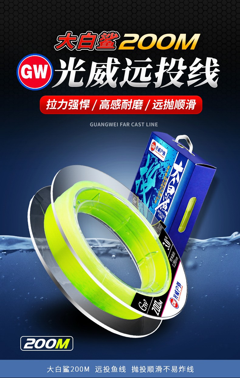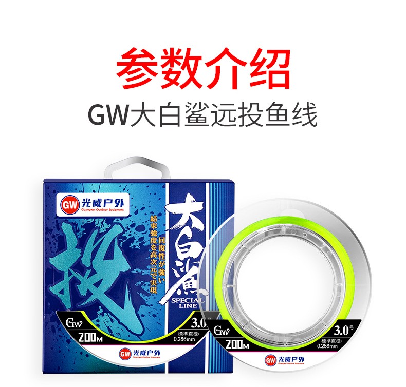 Guangwei (GW) Great White Shark Line Super Tension Long-range Fishing Line Main Line Taiwan Fishing and Sea Fishing Nylon Line Fishing Gear Supplies Great White Shark Long-range Fishing Line 200 Meters No. 2.0