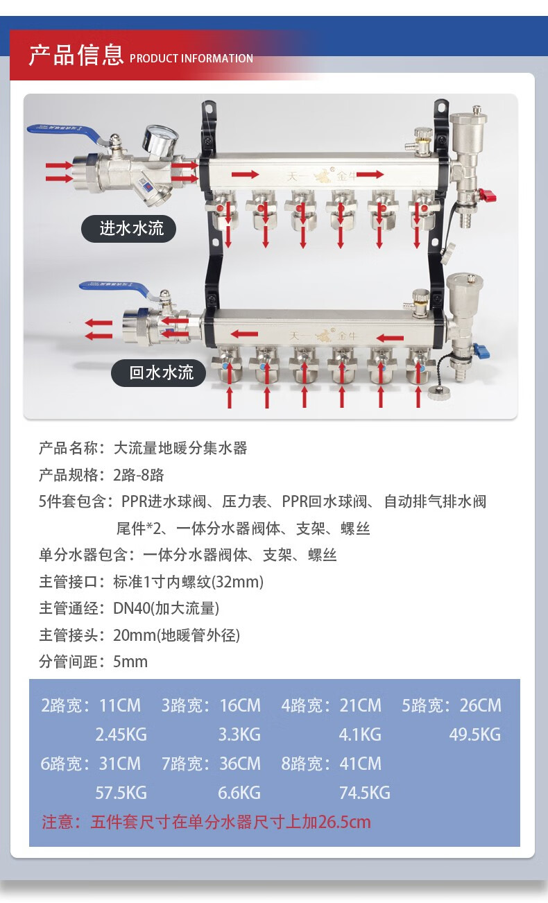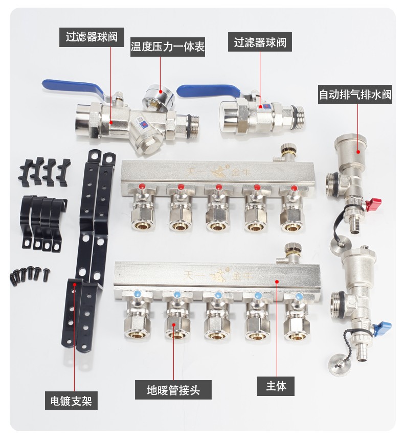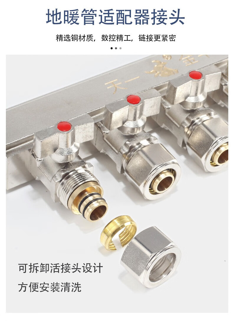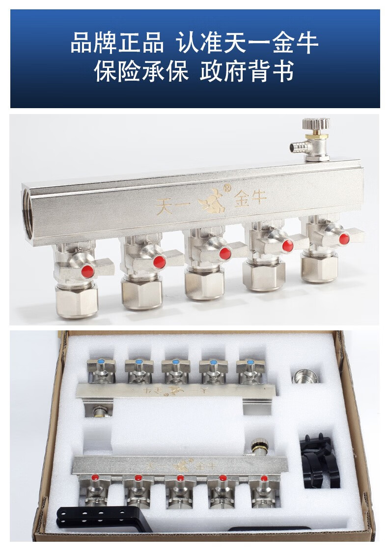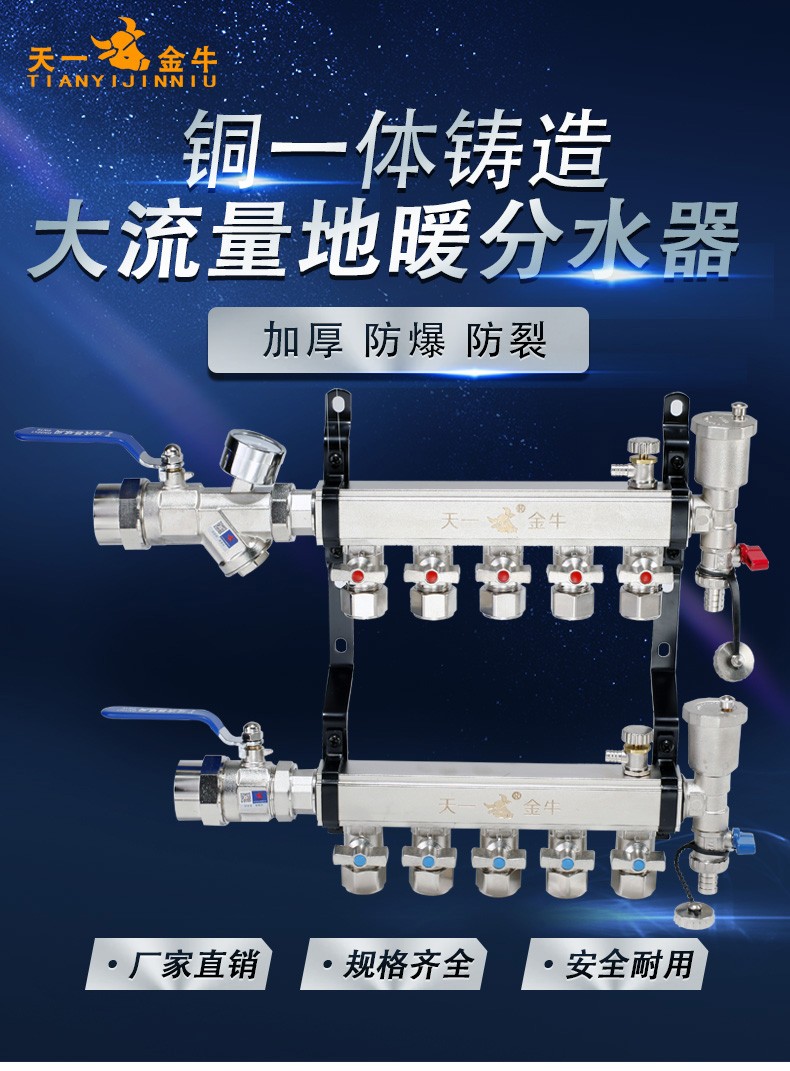 TIANYIJINNIU copper floor heating water collector, real large flow diameter, pert floor heating pipe heating valve, five-way single water distributor, large flow model