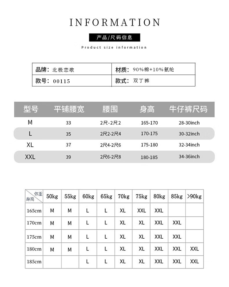 China (cm) 165 / 88-90 170 / 96-98 175 / 108-110 180 / 118-122 185 / 126-130
