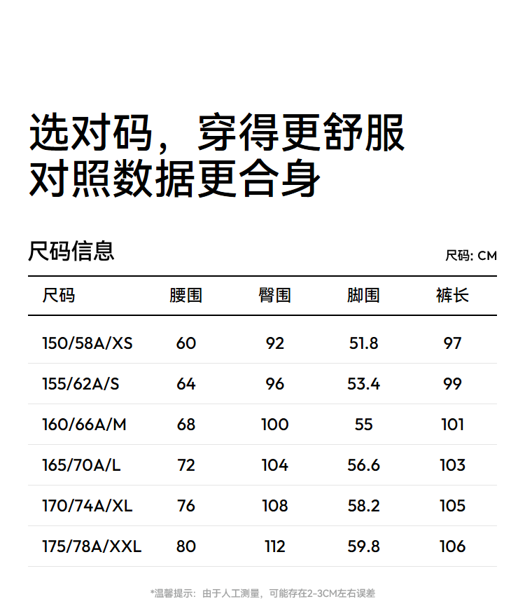 Outseam (cm) 99 cm 101.5 cm 104 cm 106.5 cm 109 cm