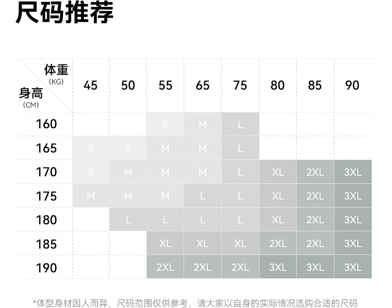 China (cm) 165 / 88-90 170 / 96-98 175 / 108-110 180 / 118-122 185 / 126-130