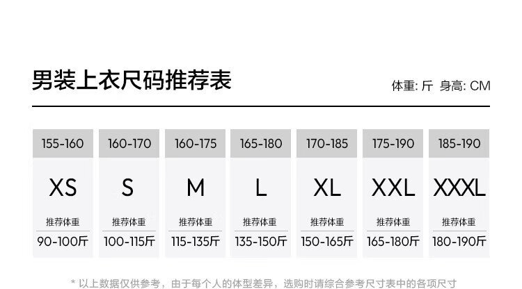 China (cm) 165 / 88-90 170 / 96-98 175 / 108-110 180 / 118-122 185 / 126-130