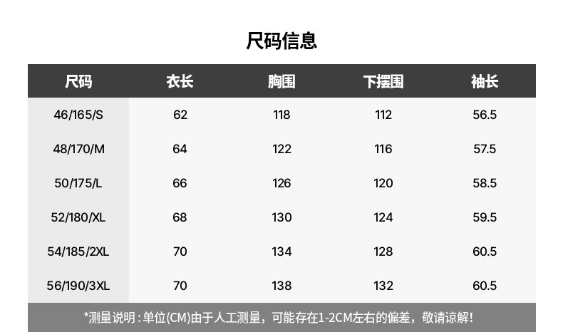 China (cm) 165 / 88-90 170 / 96-98 175 / 108-110 180 / 118-122 185 / 126-130