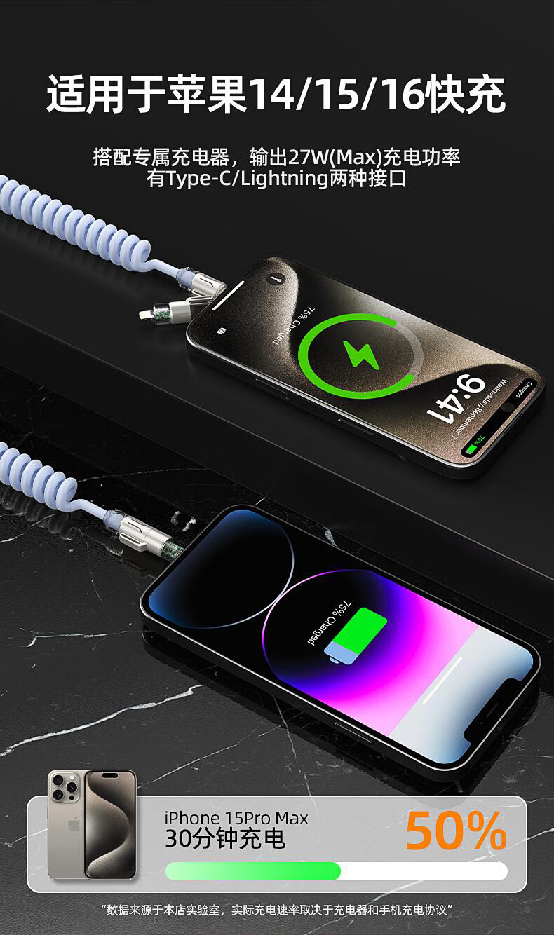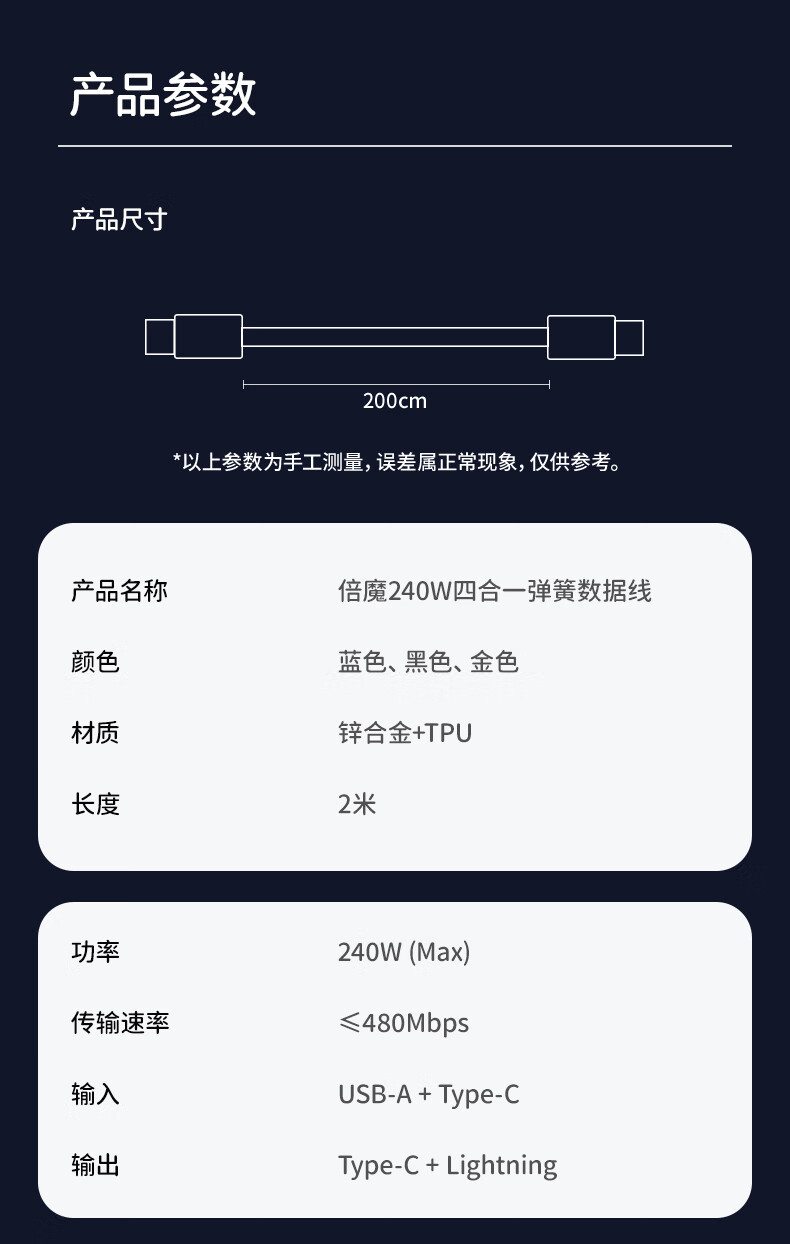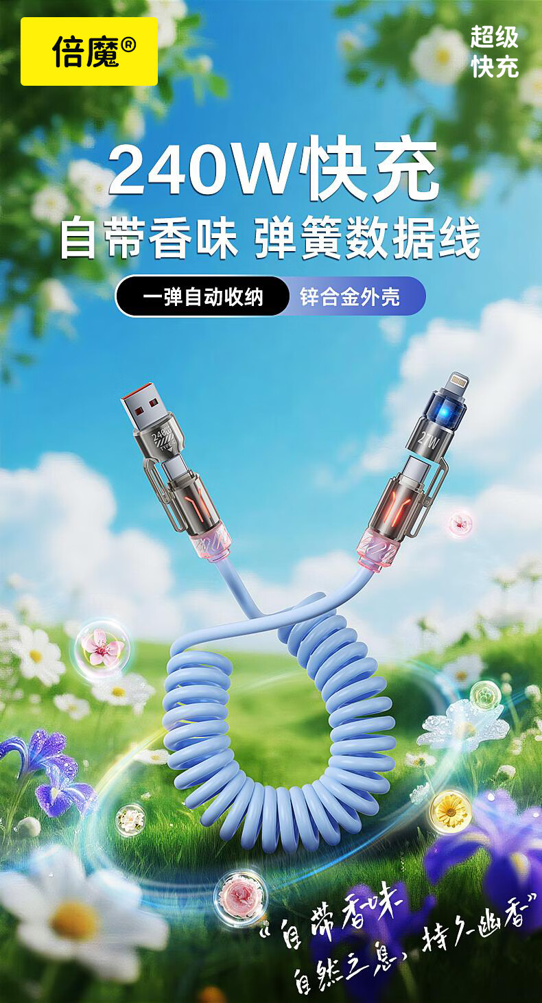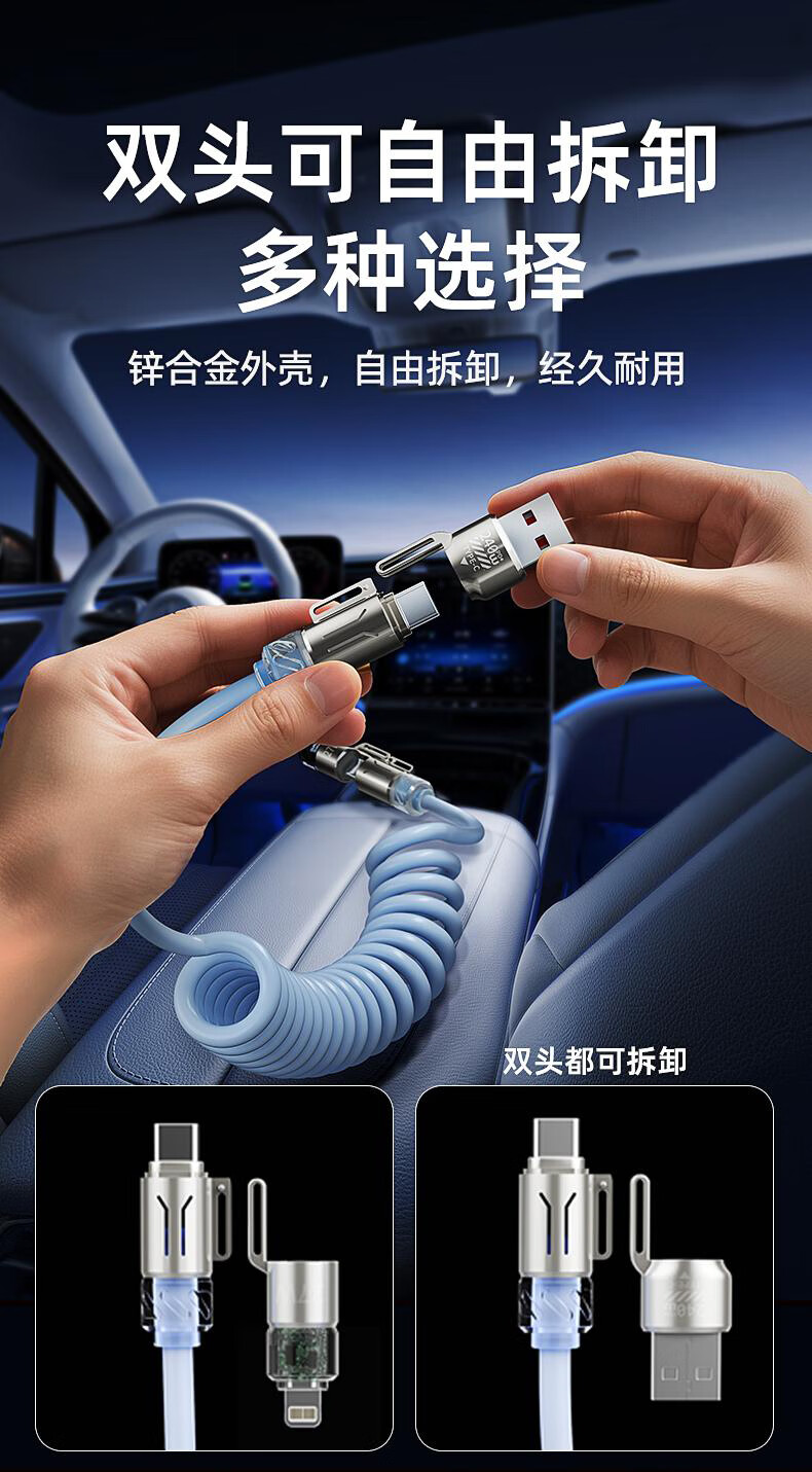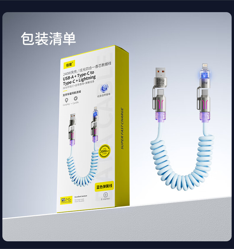 Bemo glare four-in-one spring core data cable 240W fast charging cable car screen projection suitable for Apple 17/Huawei/Xiaomi/Honor/vivo/oppo 2 meters blue