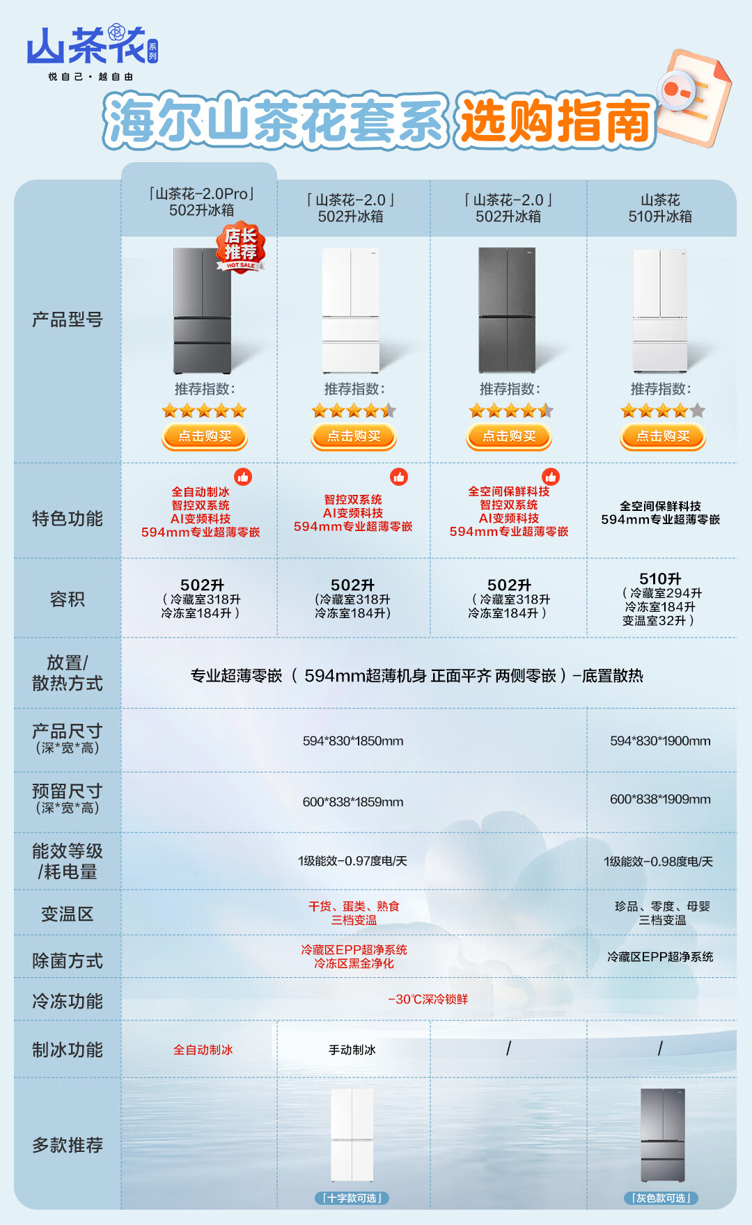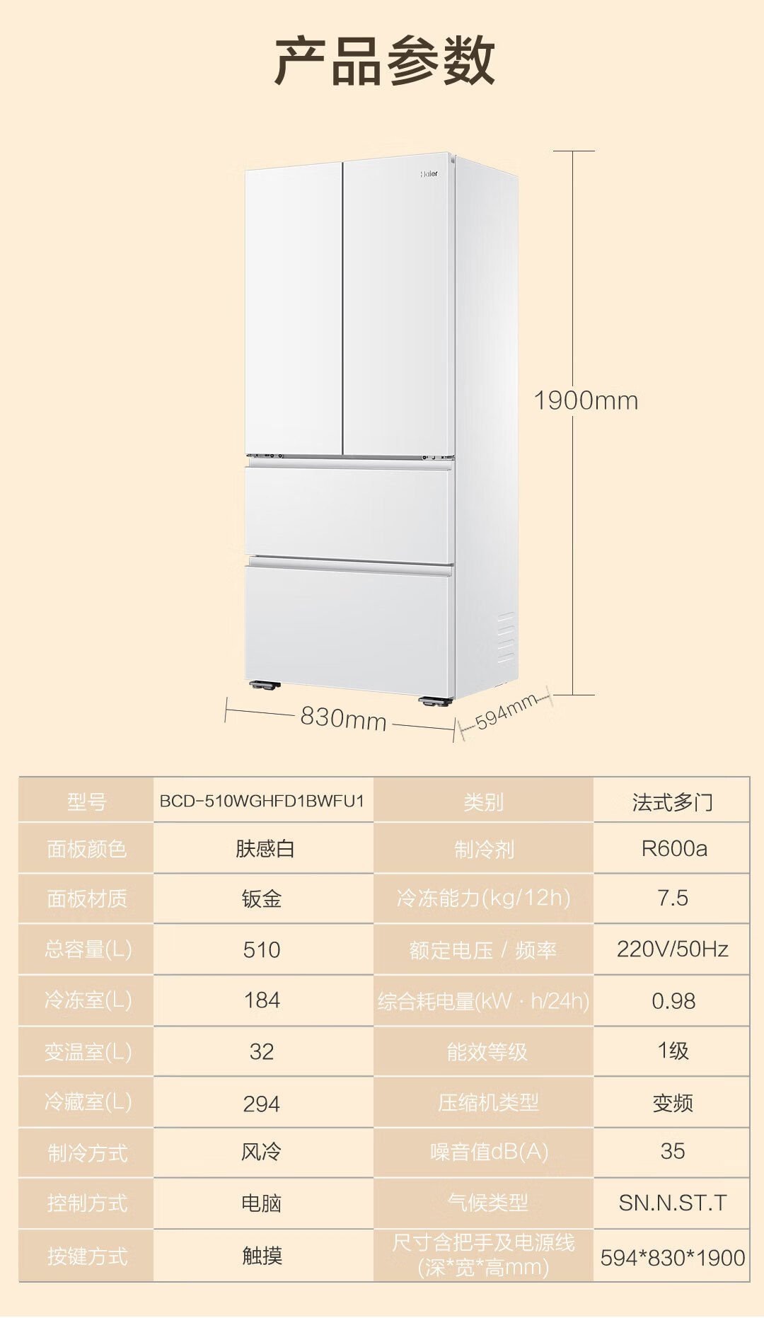 Haier Camellia 485 upgraded 510-liter full-space fresh-keeping 594mm ultra-thin zero-embedded French multi-door refrigerator first-class energy efficiency BCD-510WGHFD1BWFU1