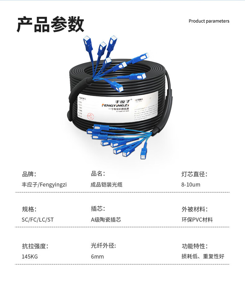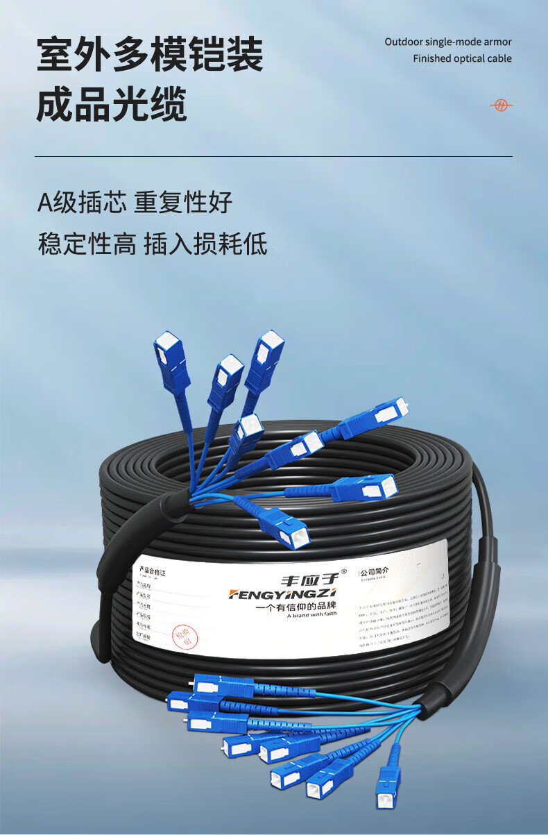 Fengyingzi Outdoor multi-mode armored optical cable finished product Optical cable jumper fusion-free optical fiber line Telecom grade 8-core SC-SC 500 meters FYZ-Z82F