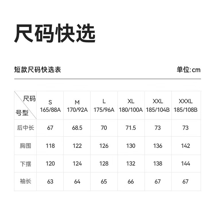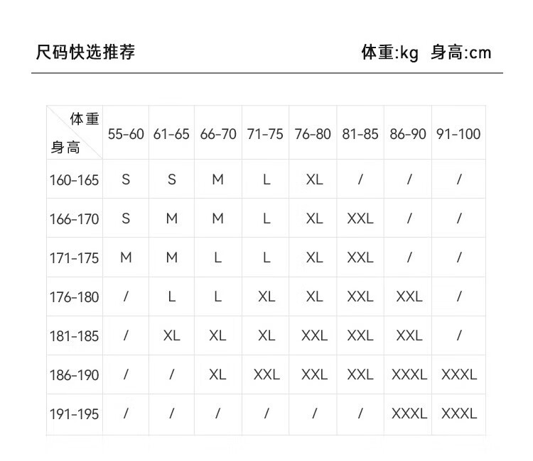 China (cm) 160-165/84-86 165-170 / 88-90 167-172 / 92-96 168-173 / 98-102 170-176 / 106-110