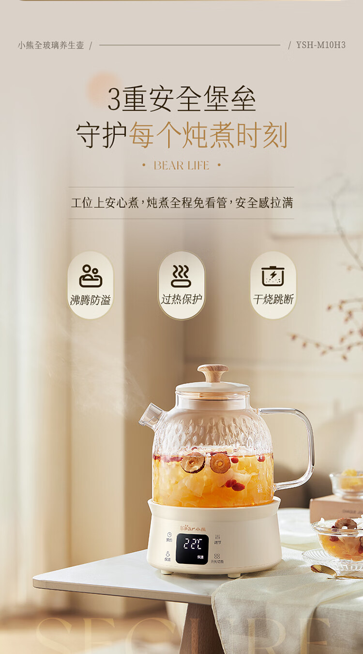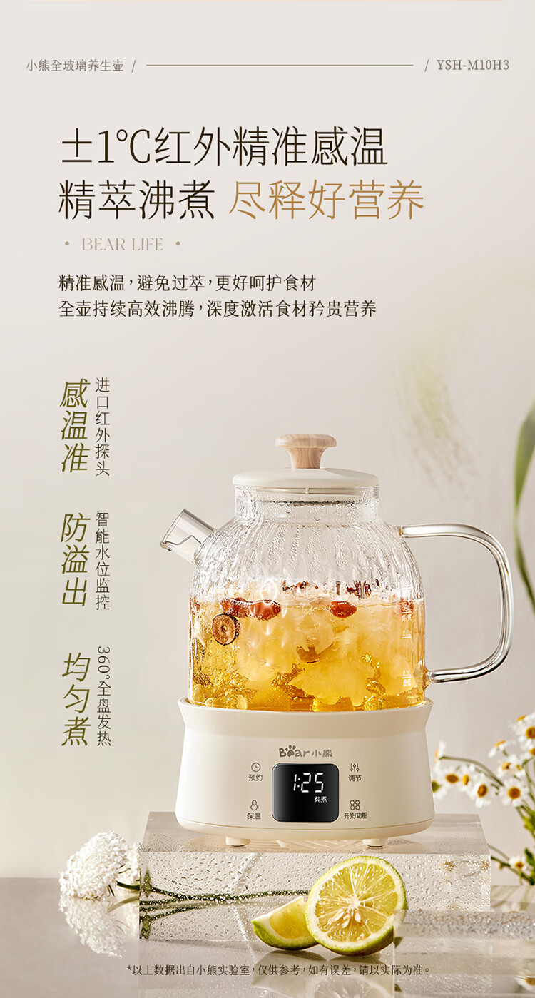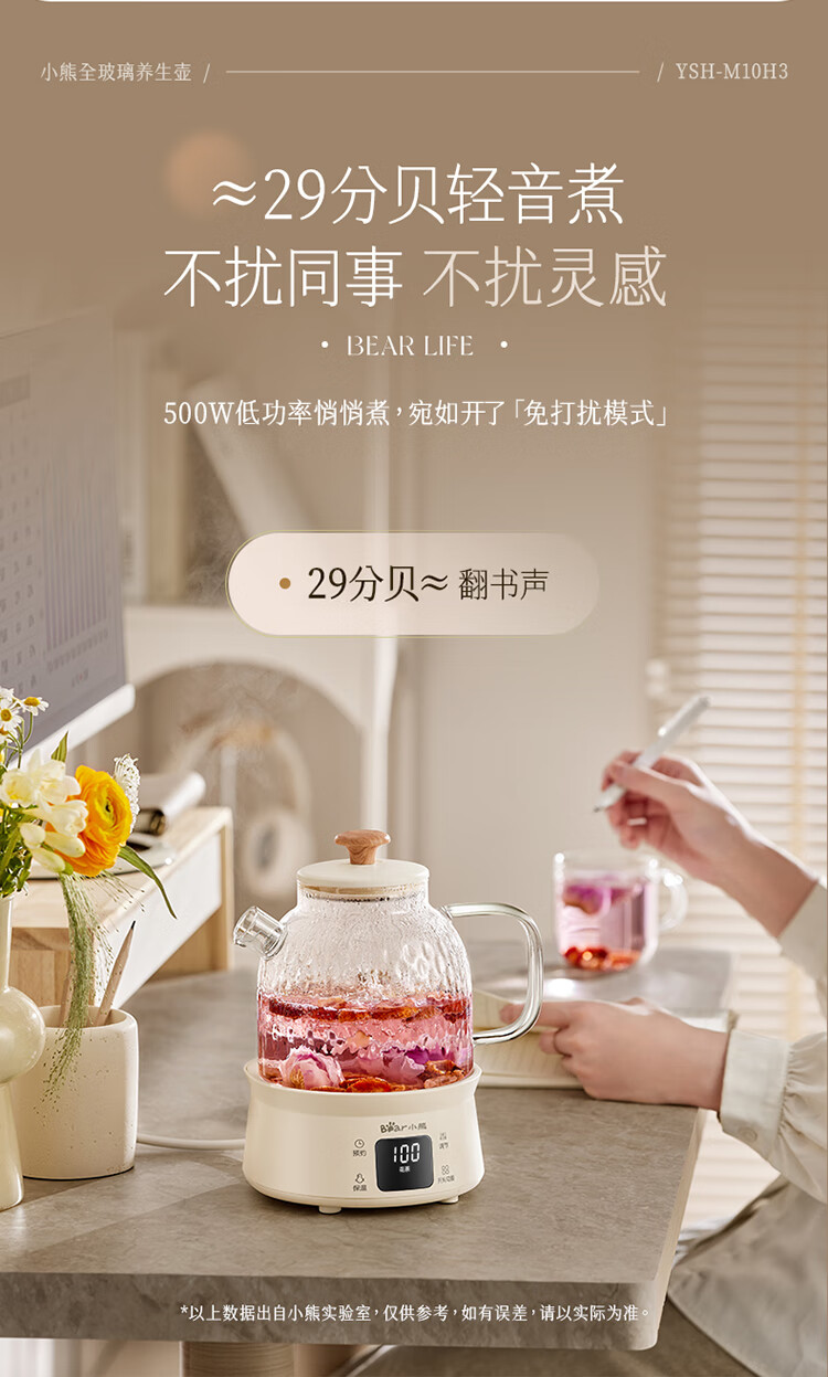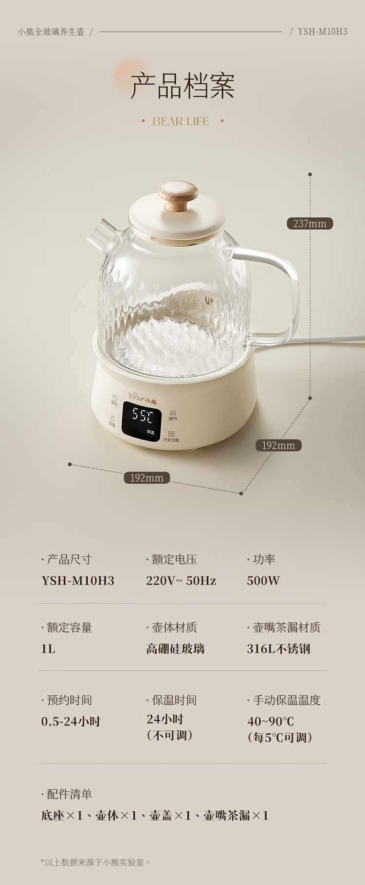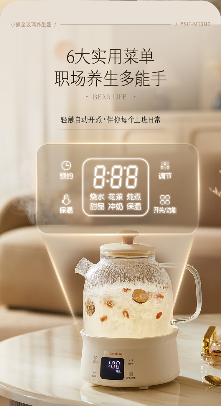Bear all-glass body health pot thermostatic kettle office multifunctional teapot flower teapot 0 metal health cup 24h reservation 24h heat preservation 1L YSH-M10H3