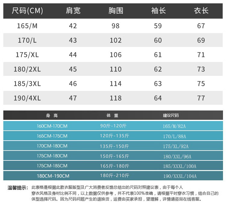 China (cm) 165 / 88-90 170 / 96-98 175 / 108-110 180 / 118-122 185 / 126-130