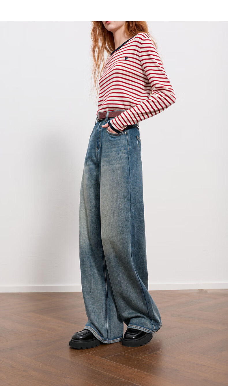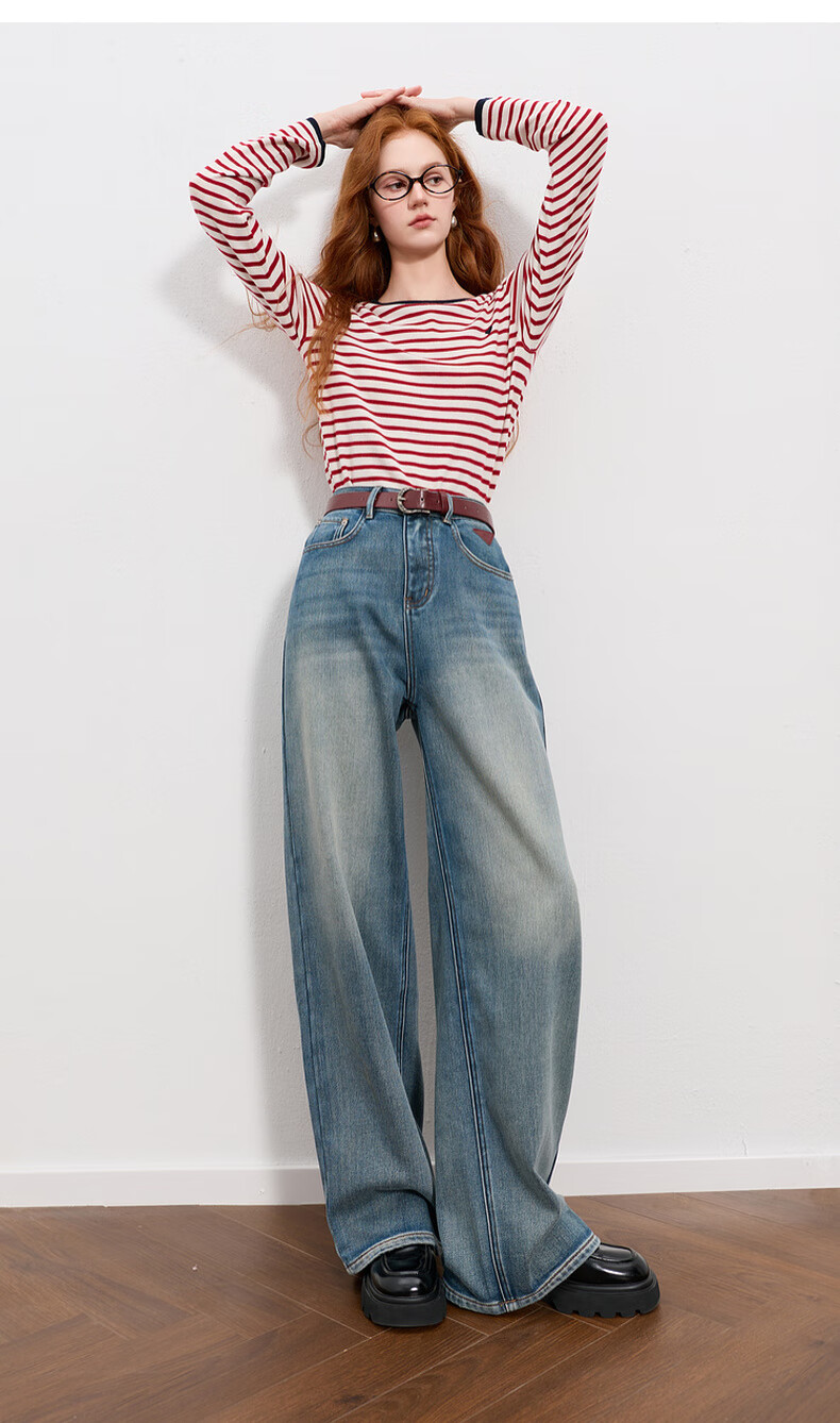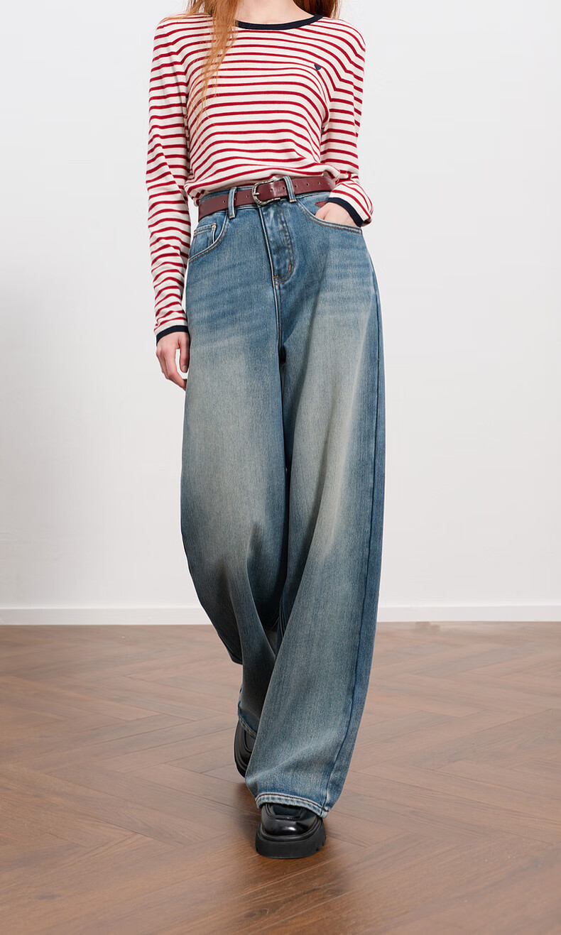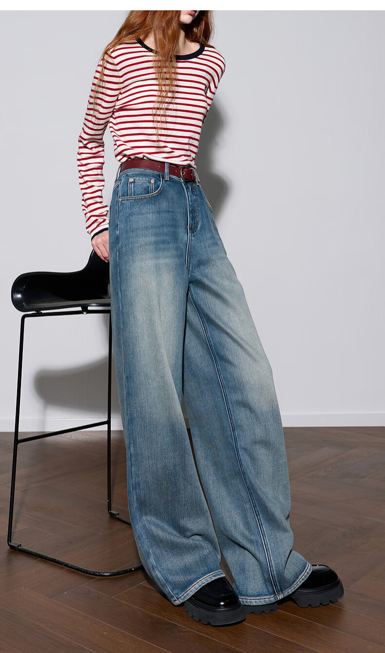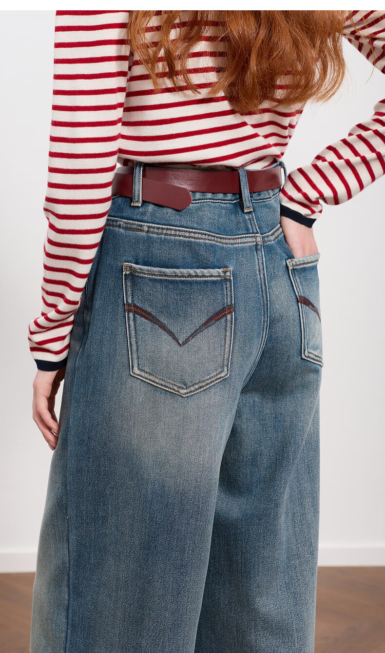 Sancai 2025 winter new one-piece velvet brushed jeans high-waisted wide-leg pants loose M