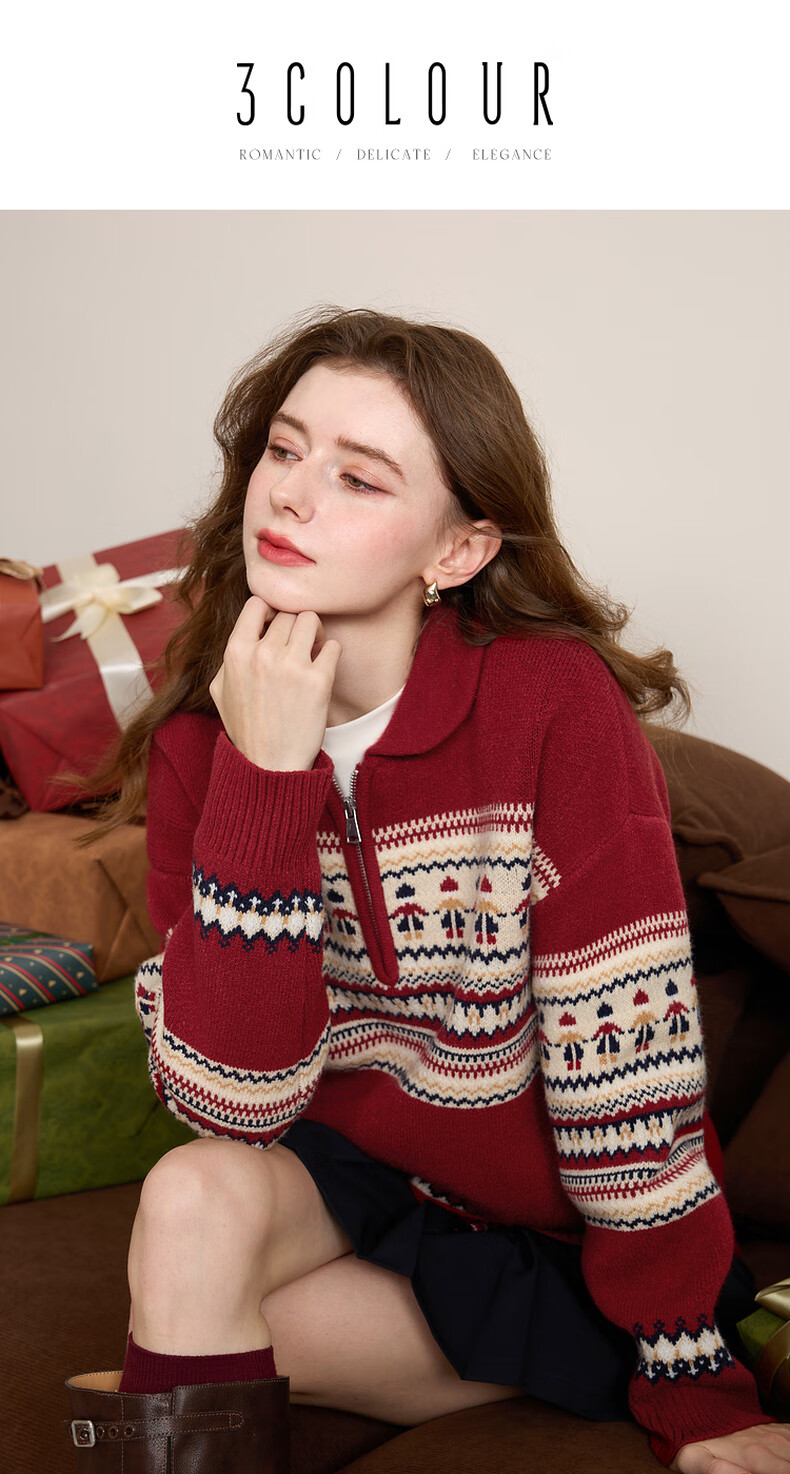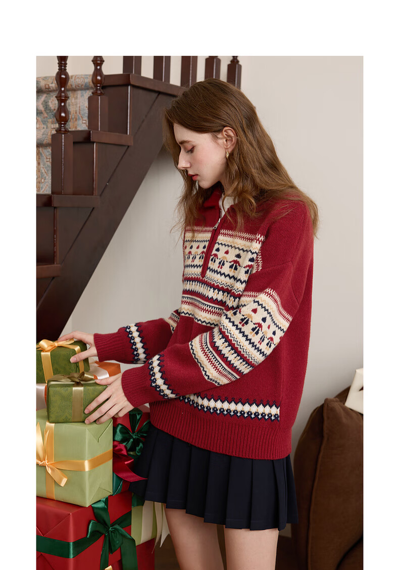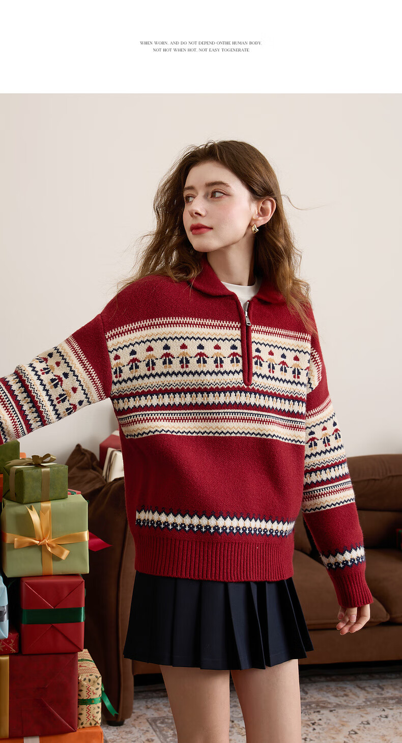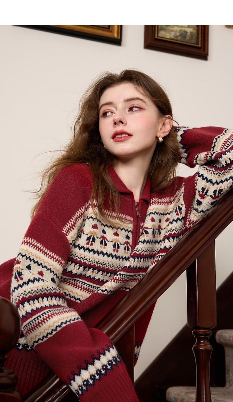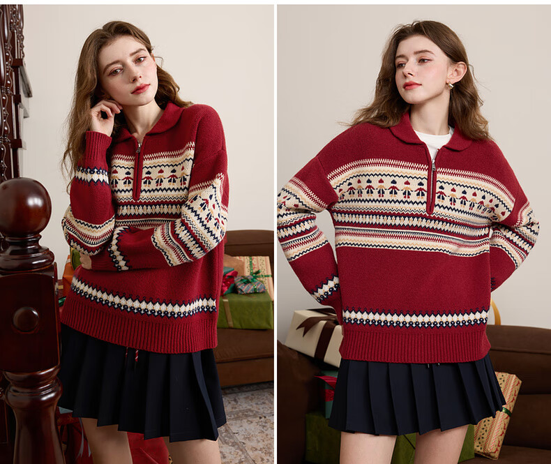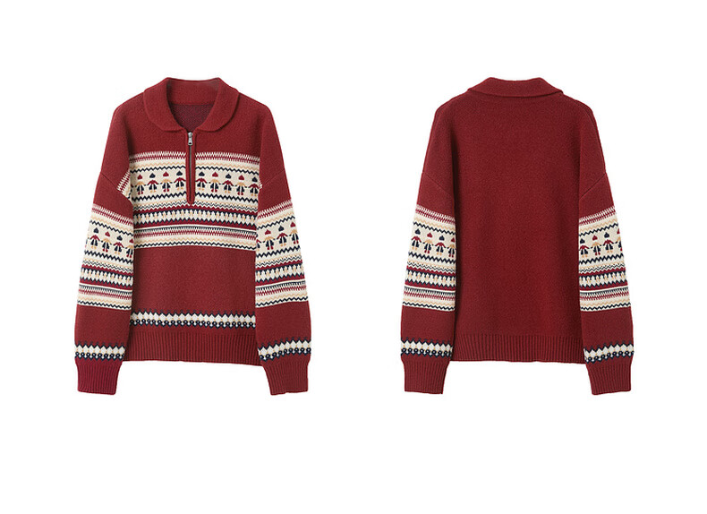 Sancai 2025 winter new red zipper lapel atmospheric jacquard sweater loose shoulder sleeves M