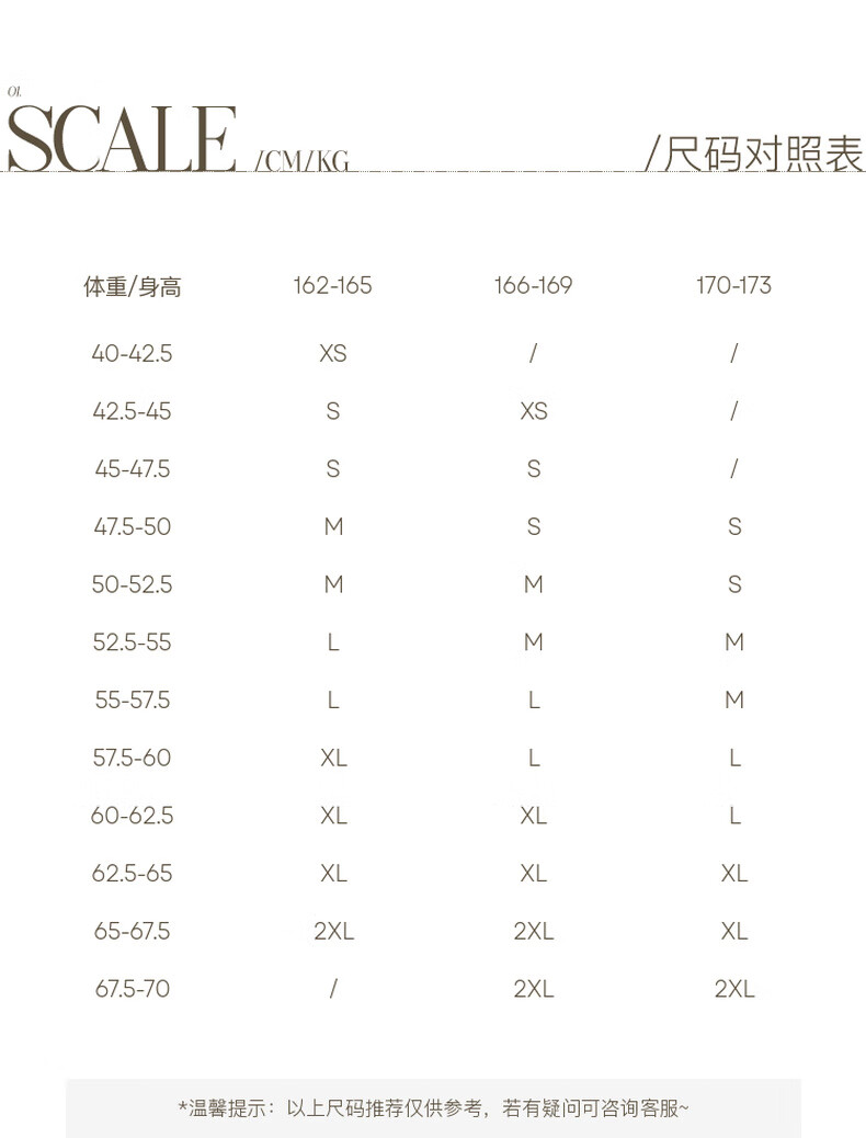 China (cm) 160-165/84-86 165-170 / 88-90 167-172 / 92-96 168-173 / 98-102 170-176 / 106-110
