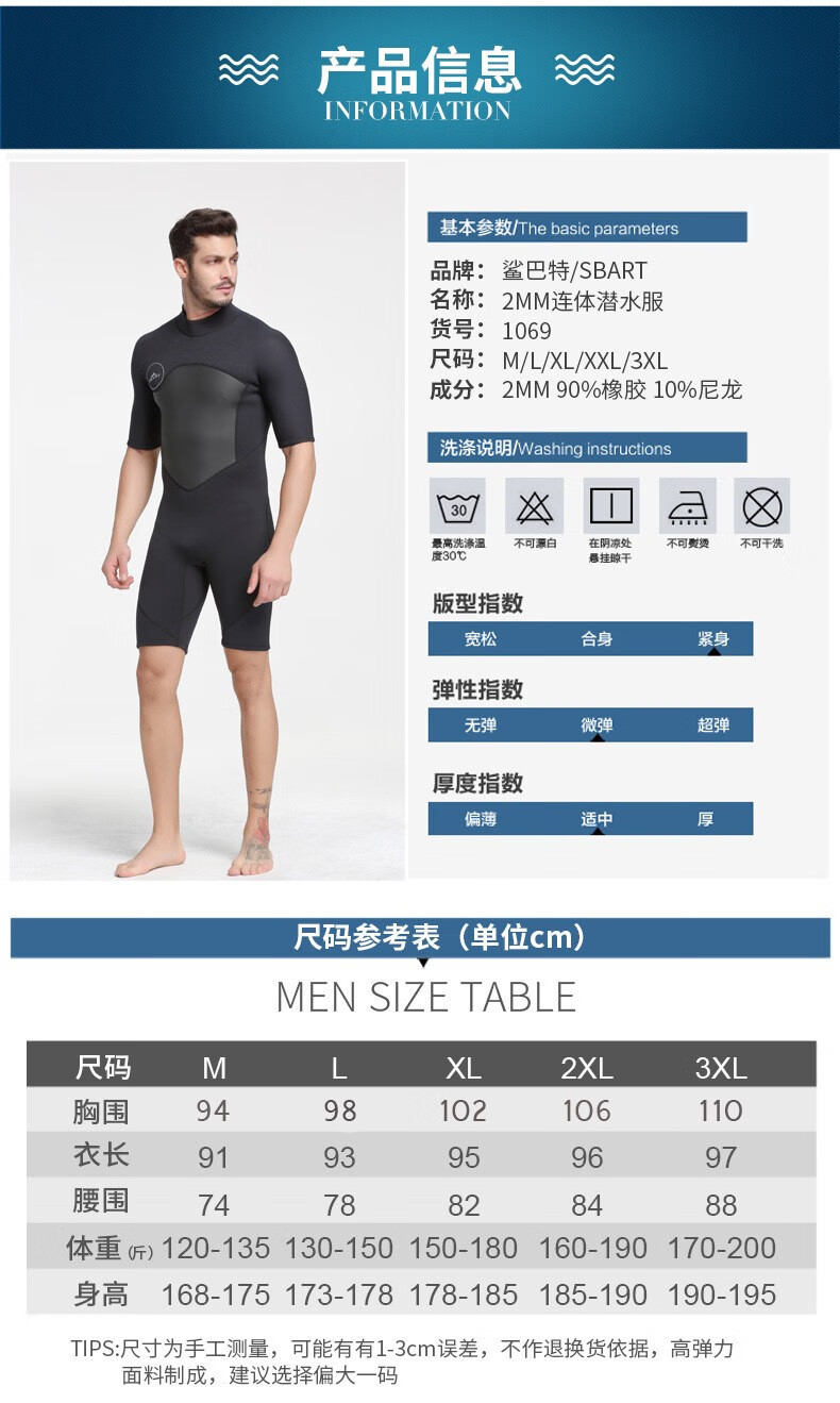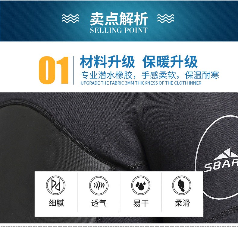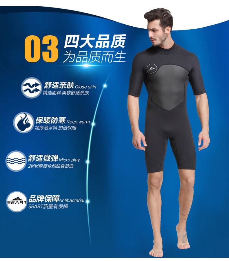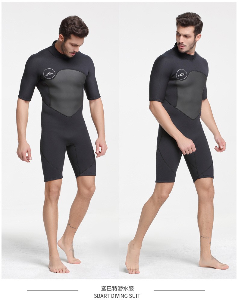 SBART new wetsuit men's one-piece 2MM short-sleeved neoprene thickened warm surfing snorkeling winter swimsuit 1069 black L