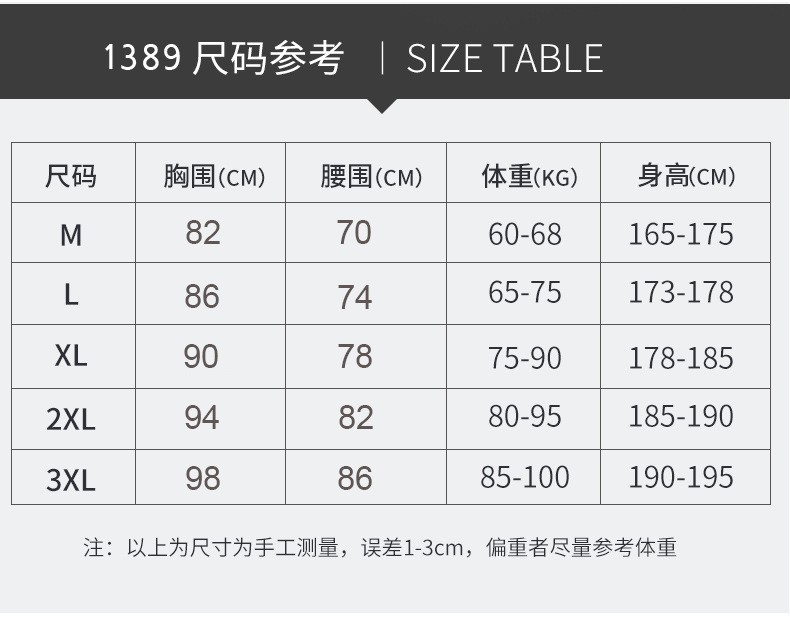 China (cm) 165 / 88-90 170 / 96-98 175 / 108-110 180 / 118-122 185 / 126-130