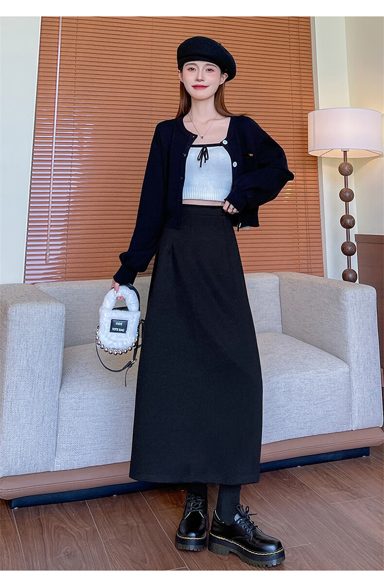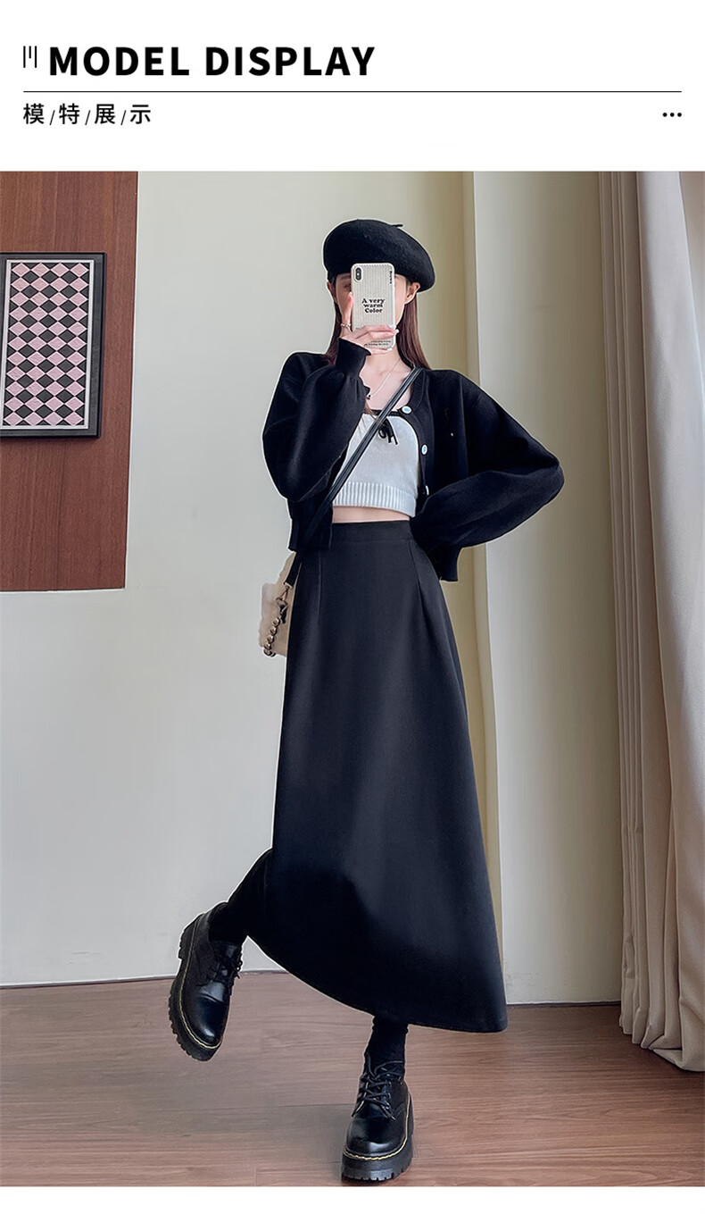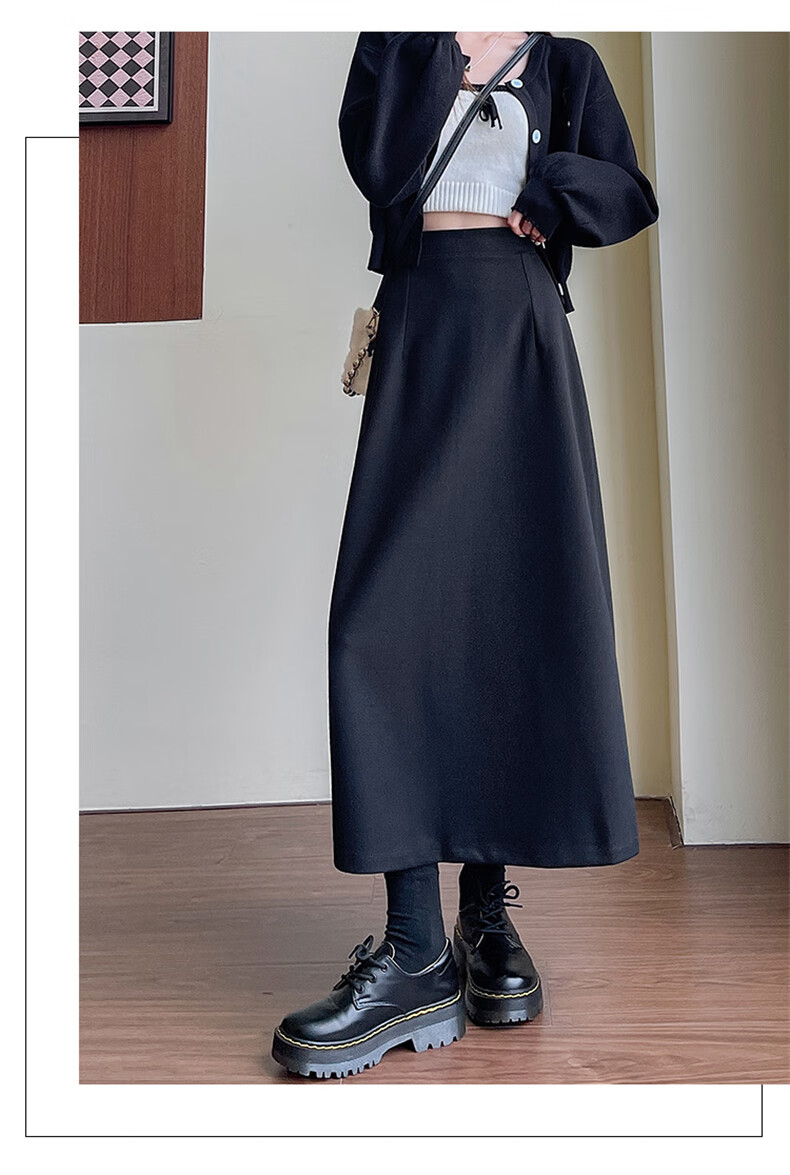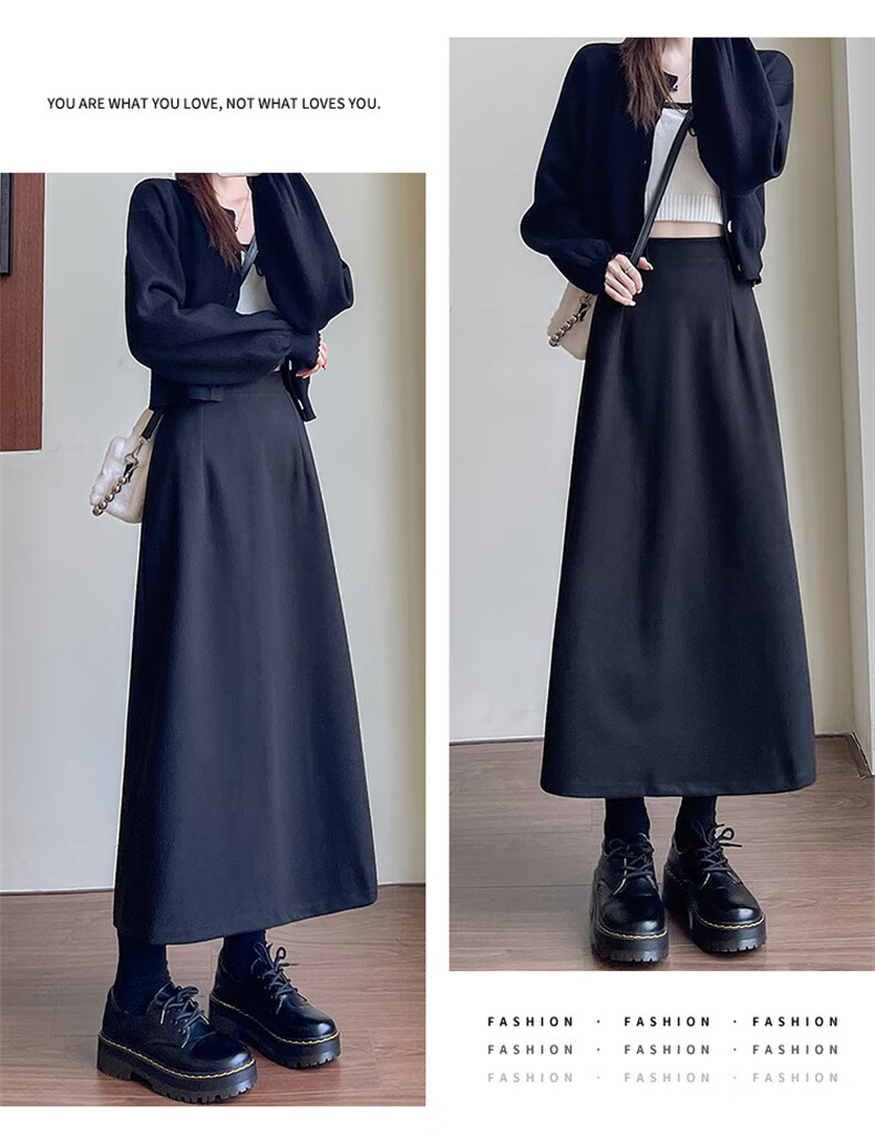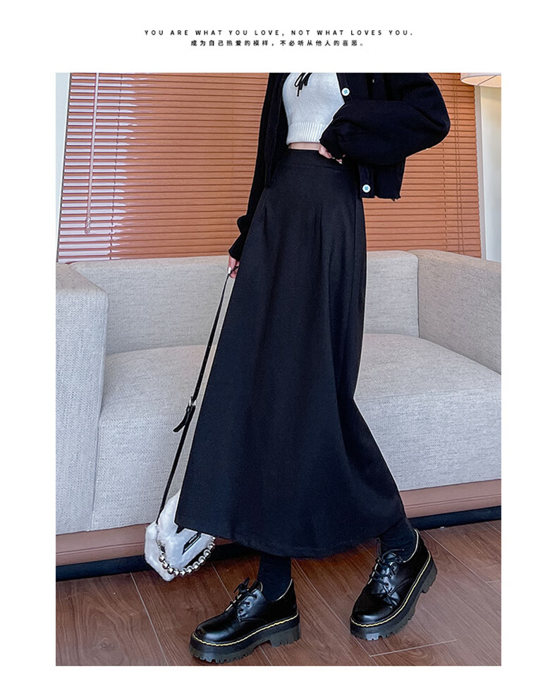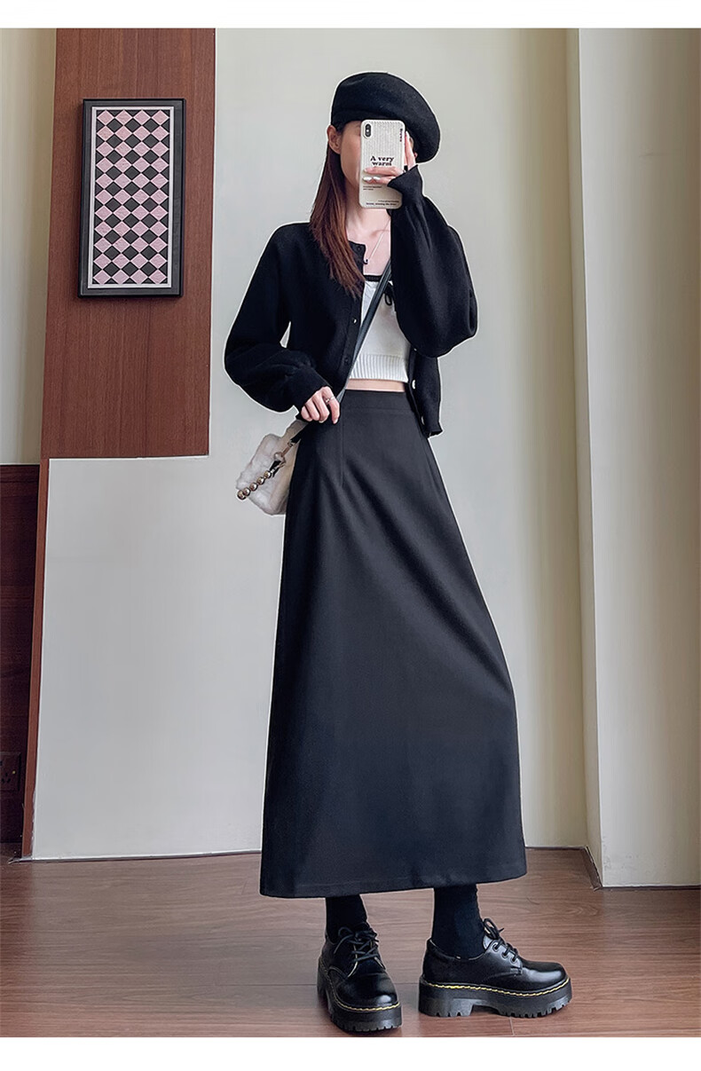 Langsha black woolen skirt for women winter 2025 new mid-length high-waisted A-line slit Korean version slimming hip skirt
