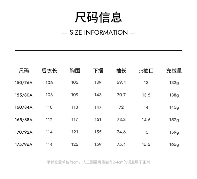 China (cm) 160-165/84-86 165-170 / 88-90 167-172 / 92-96 168-173 / 98-102 170-176 / 106-110