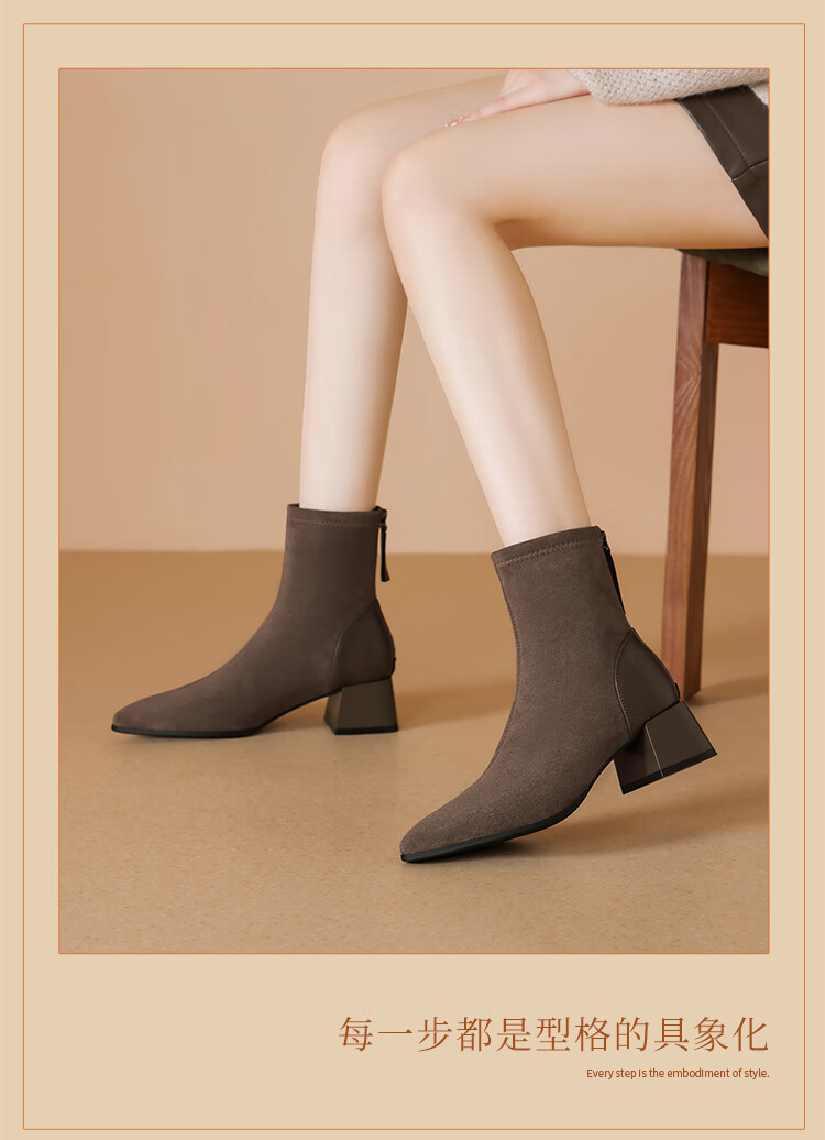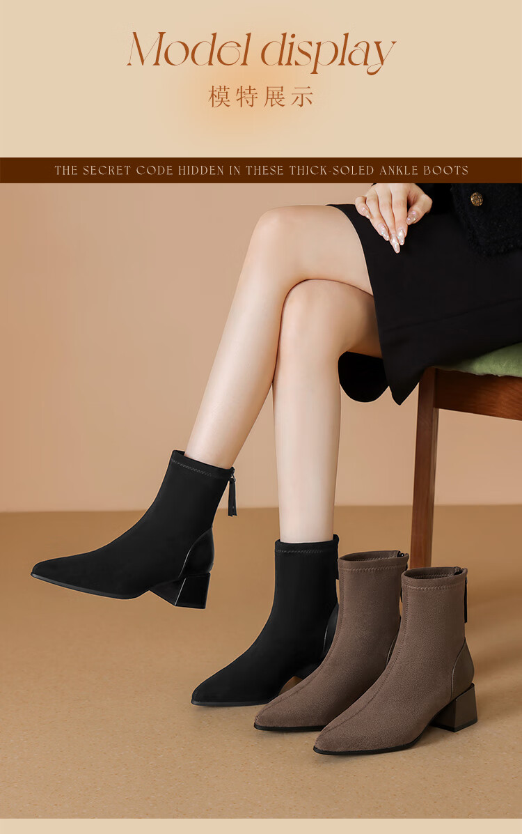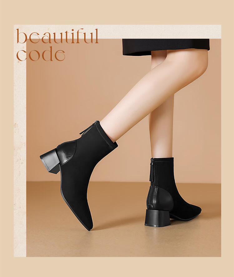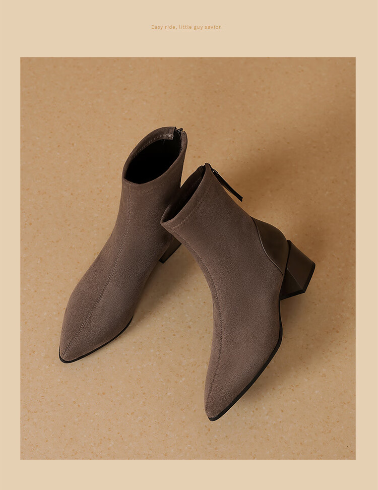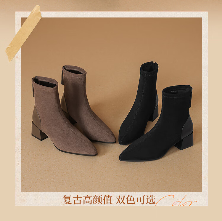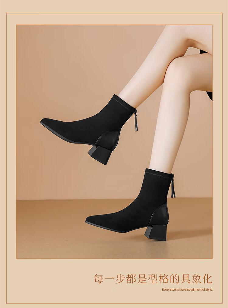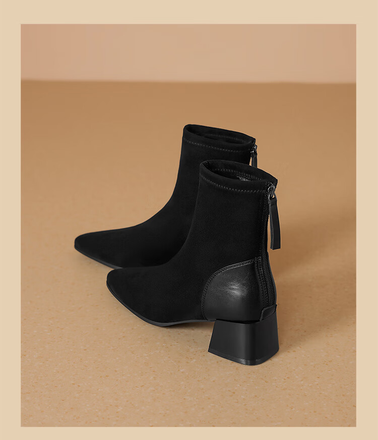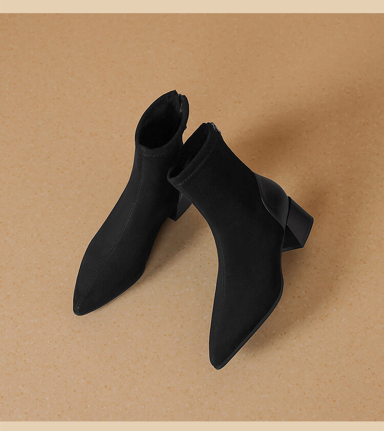 ZHR short boots women's retro thin women's boots winter plus velvet thick high heel suede ankle boots pointed toe elastic boots BL652A black 38