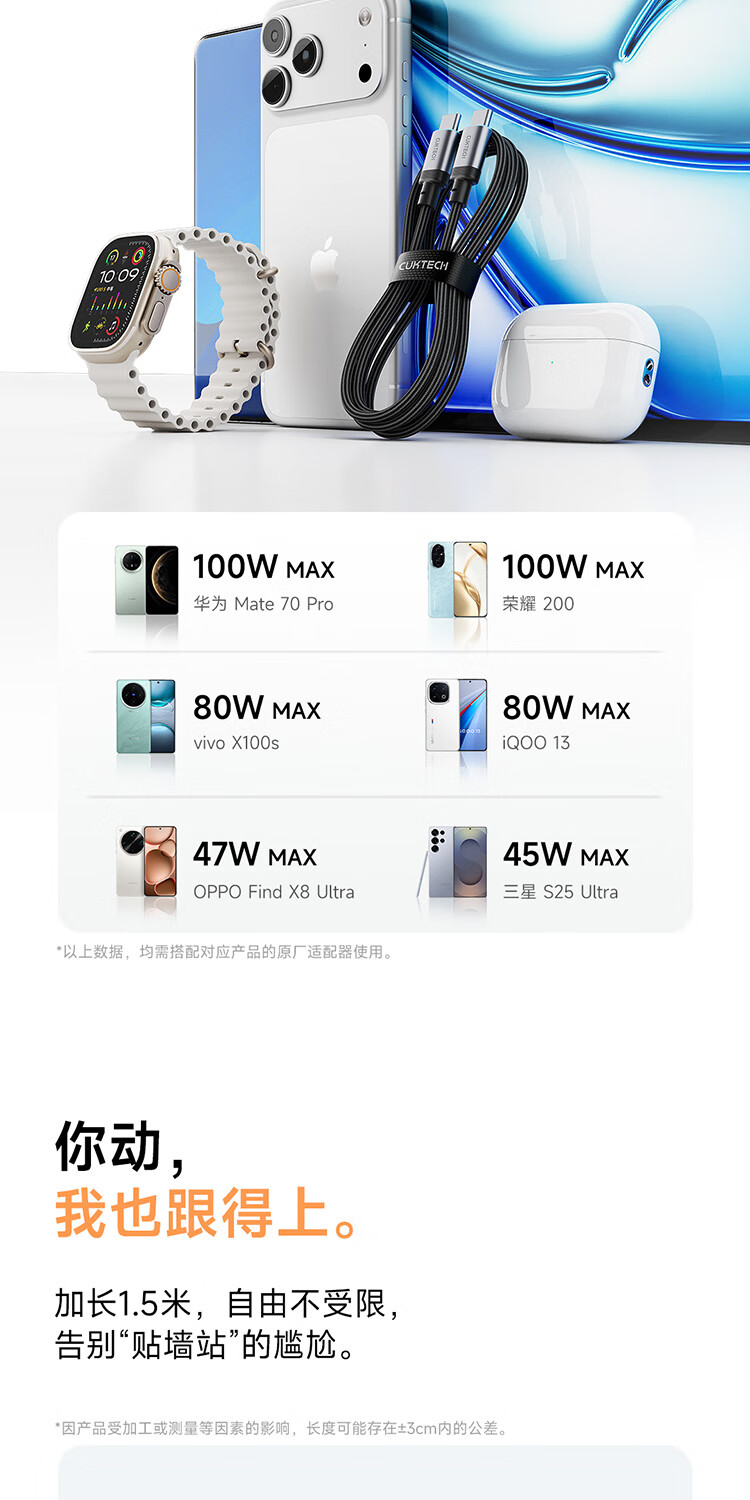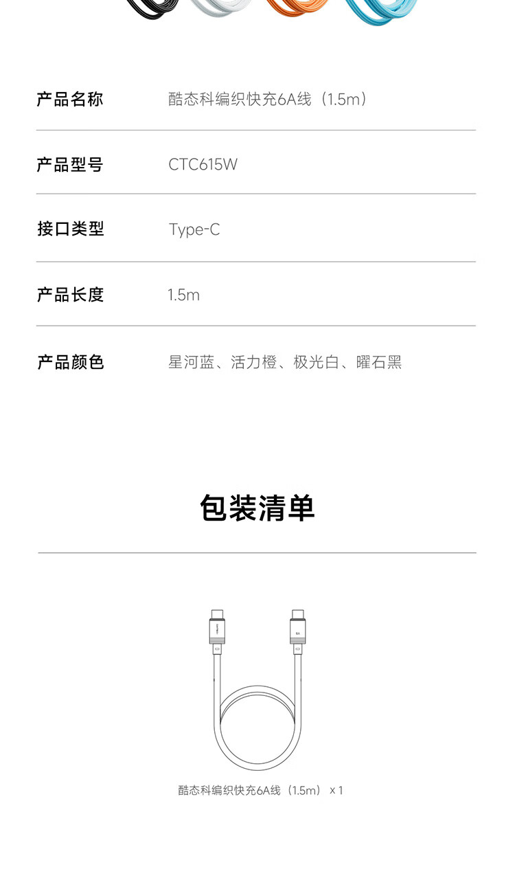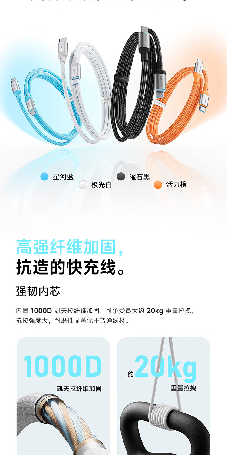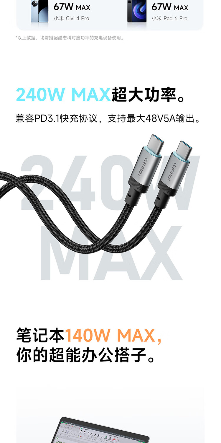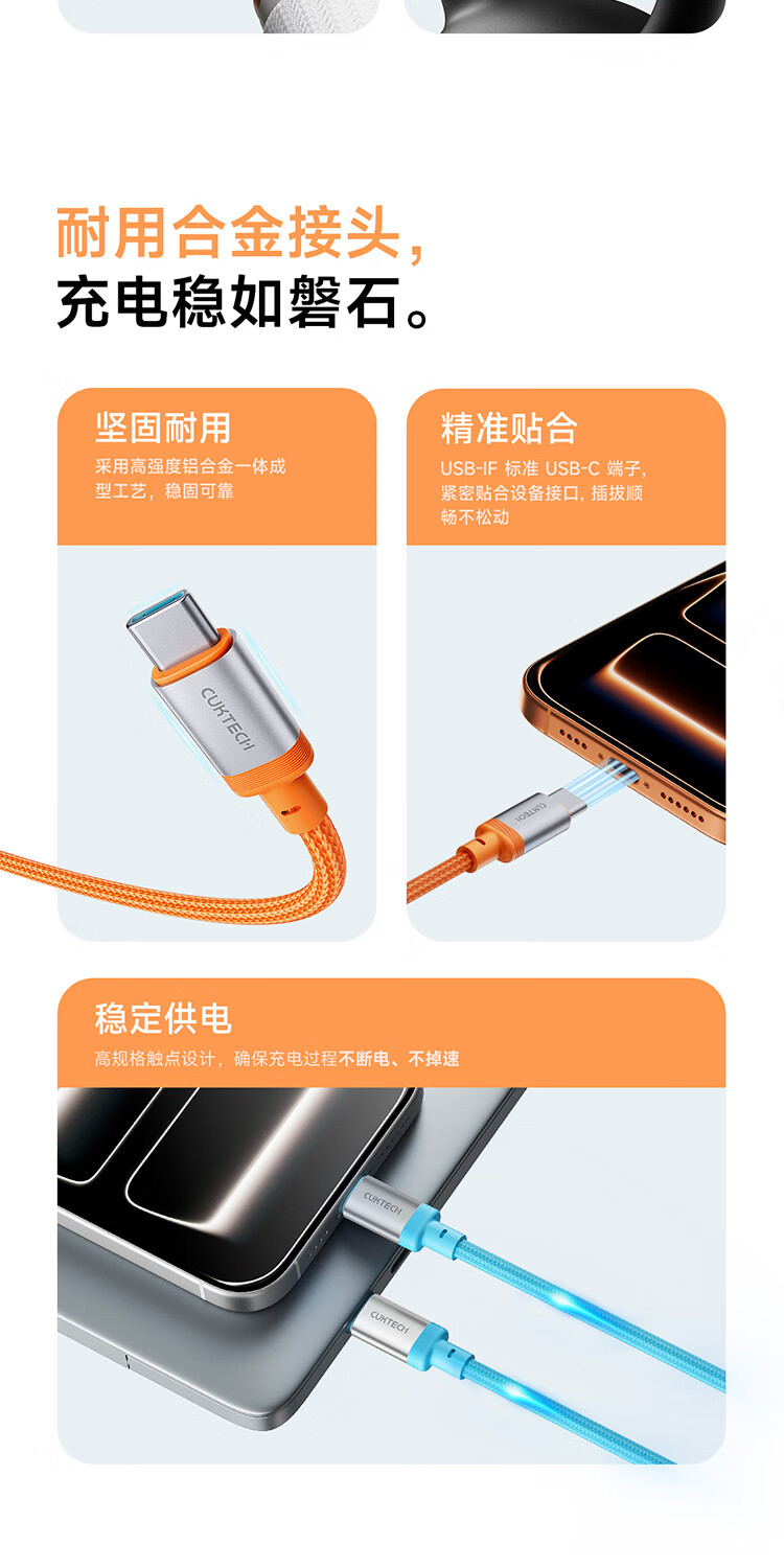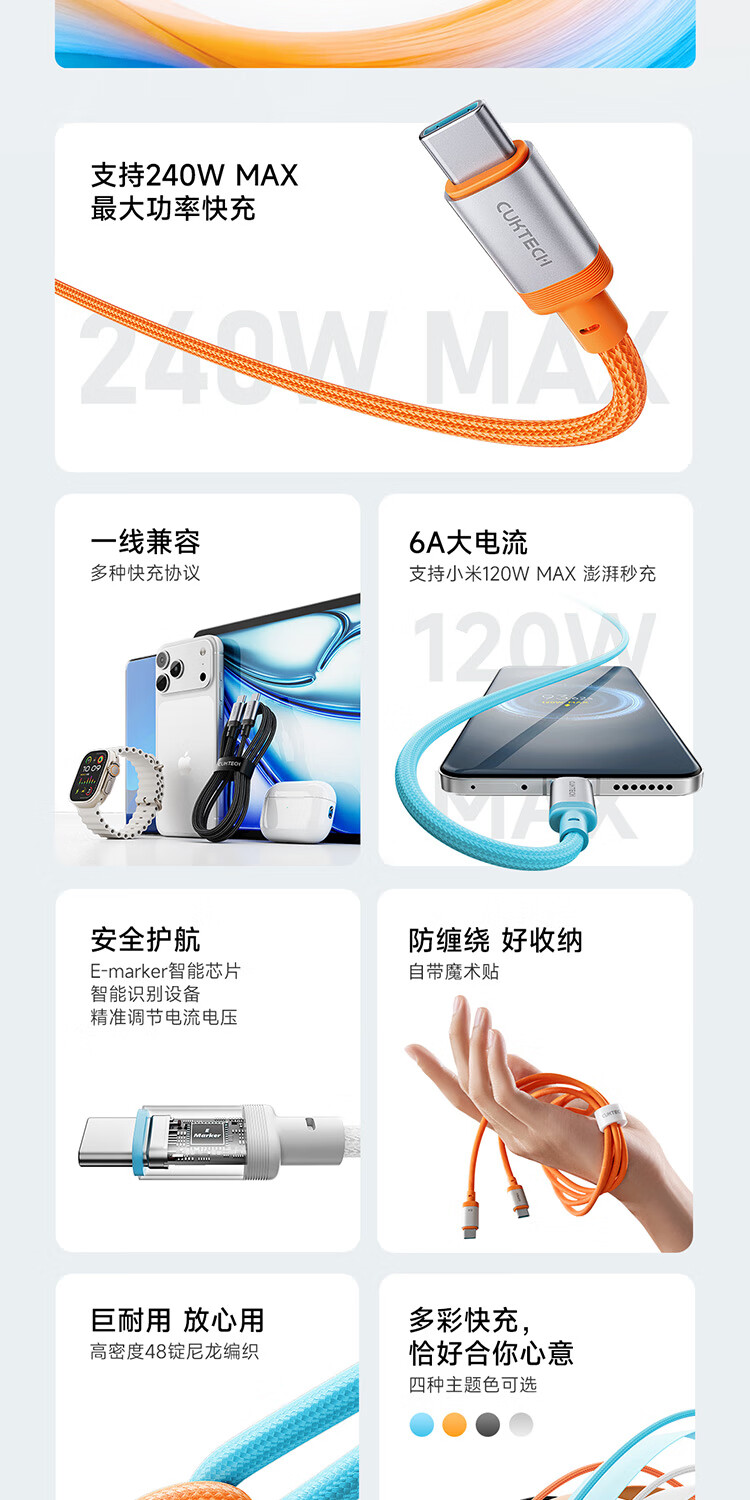 CUKTECH cool state science charging cable Type-C data cable 240W high power 6A current ctoc braided fast charging suitable for Apple 17/ipad/Xiaomi Huawei mobile phone notebook 1.5m