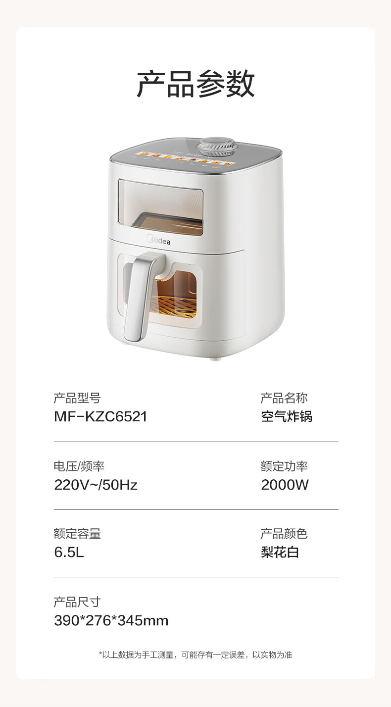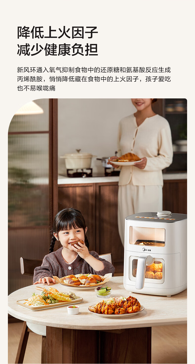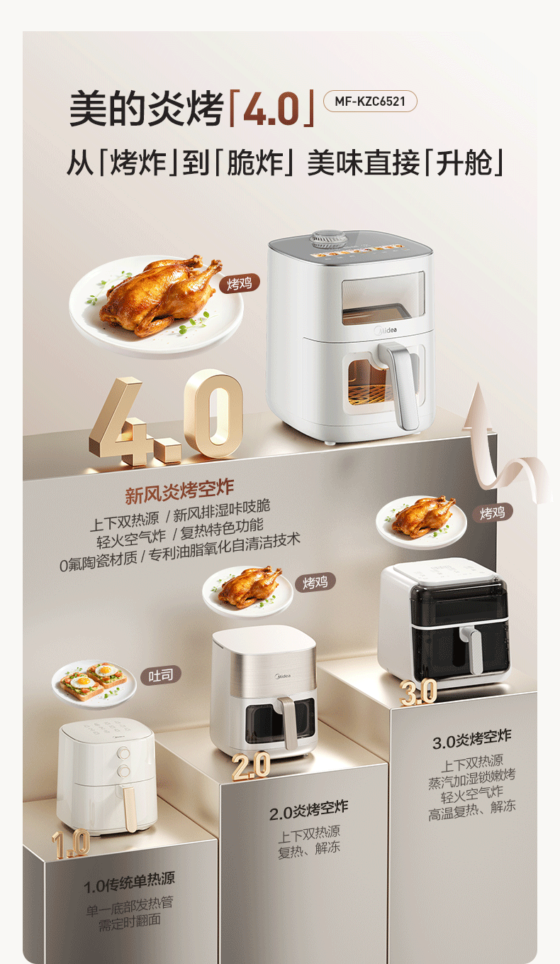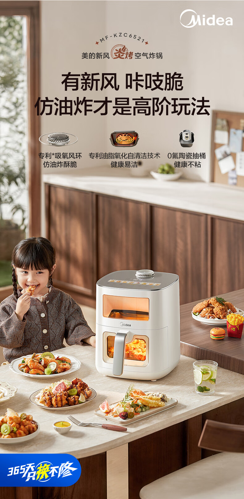 Midea New Fengyan Grilled Air Fryer 2025 New Turn-Free 0 Fluorine Ceramic Household Large Capacity 6.5L Large View Window Air Fryer Steaming and Grilling Integrated KZC6521