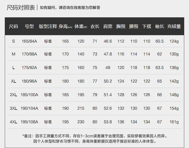 China (cm) 165 / 88-90 170 / 96-98 175 / 108-110 180 / 118-122 185 / 126-130