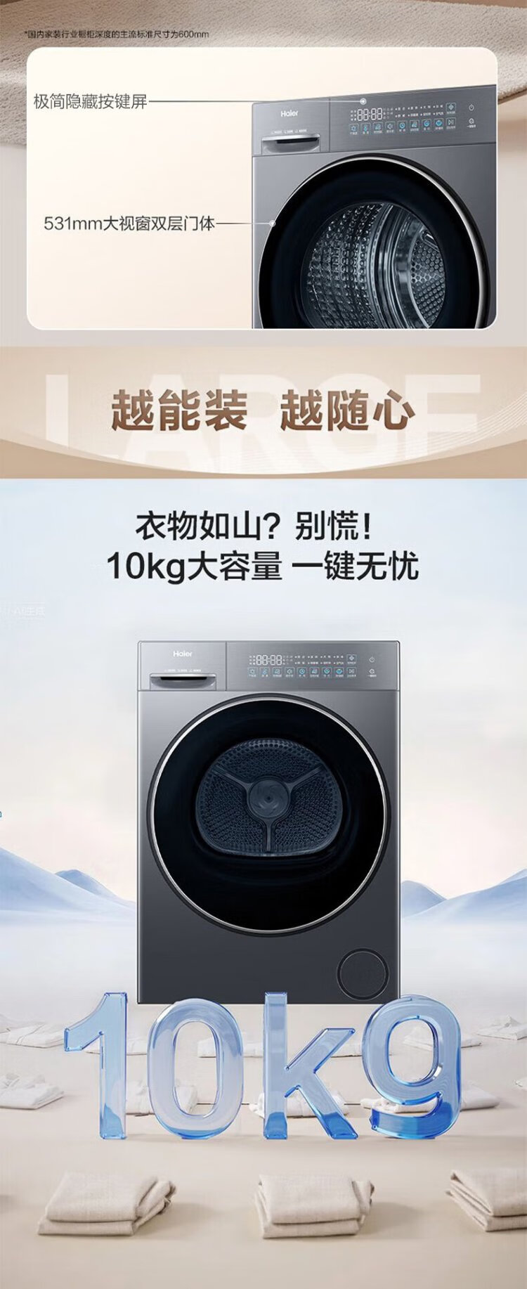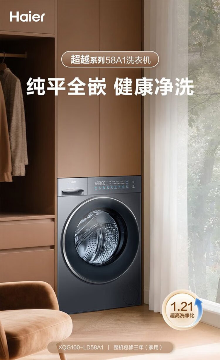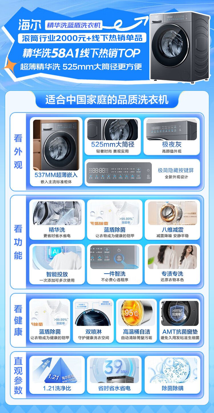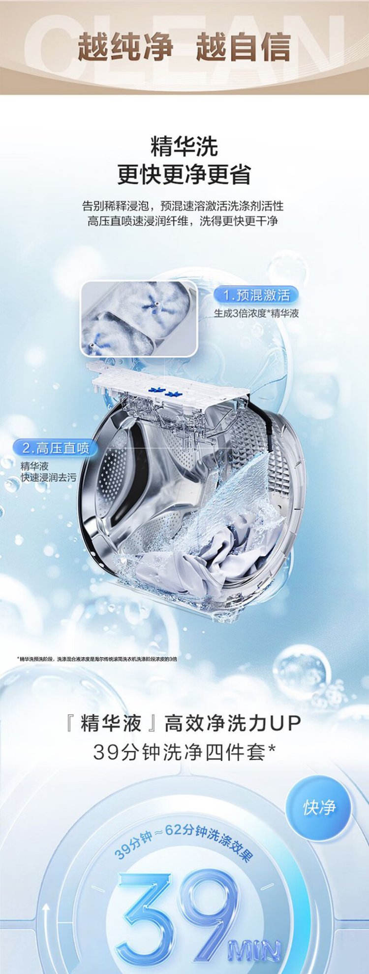 Haier Essence Washing Drum Washing Machine 10KG Household Fully Automatic Frequency Conversion Ultra-Thin Smart Put Blue Shield Sterilization Eight-Dimensional Shock Absorption One Piece Smart Wash + Anti-Rust XQG100-LD58A1