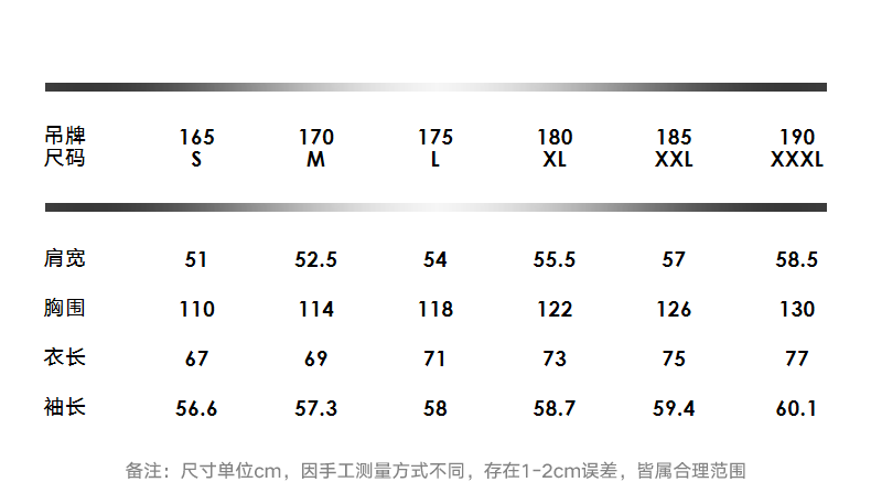 China (cm) 165 / 88-90 170 / 96-98 175 / 108-110 180 / 118-122 185 / 126-130