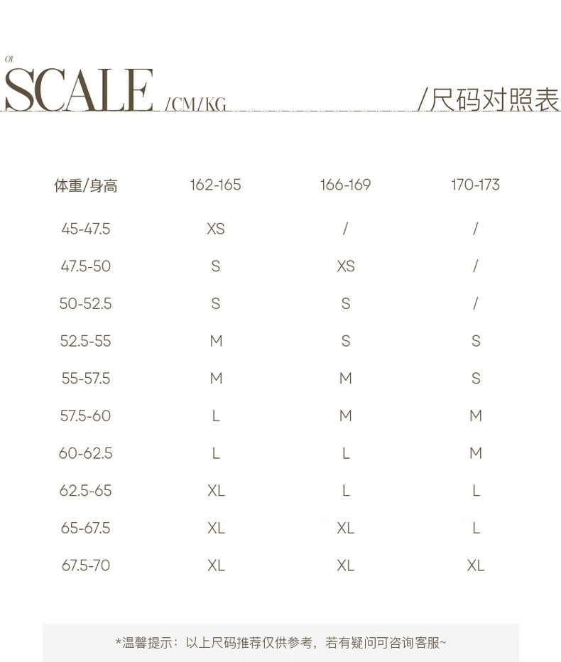 China (cm) 160-165/84-86 165-170 / 88-90 167-172 / 92-96 168-173 / 98-102 170-176 / 106-110