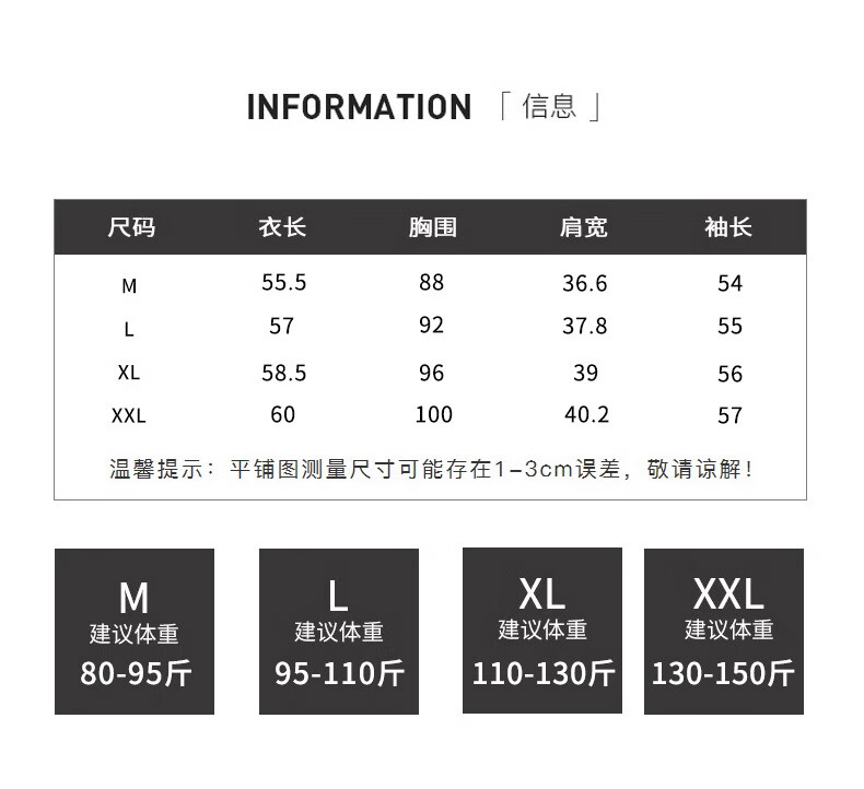 China (cm) 165 / 88-90 170 / 96-98 175 / 108-110 180 / 118-122 185 / 126-130
