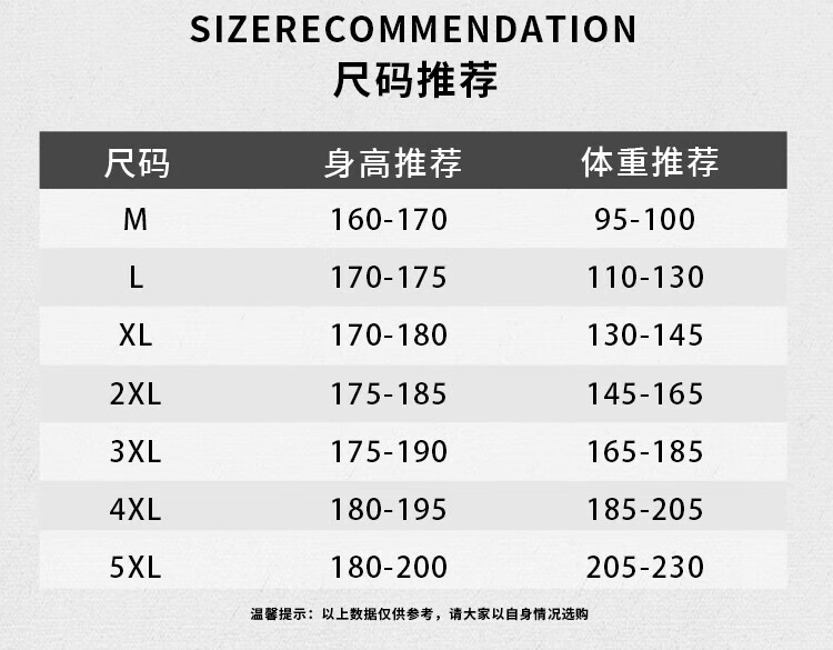 China (cm) 160-165/84-86 165-170 / 88-90 167-172 / 92-96 168-173 / 98-102 170-176 / 106-110