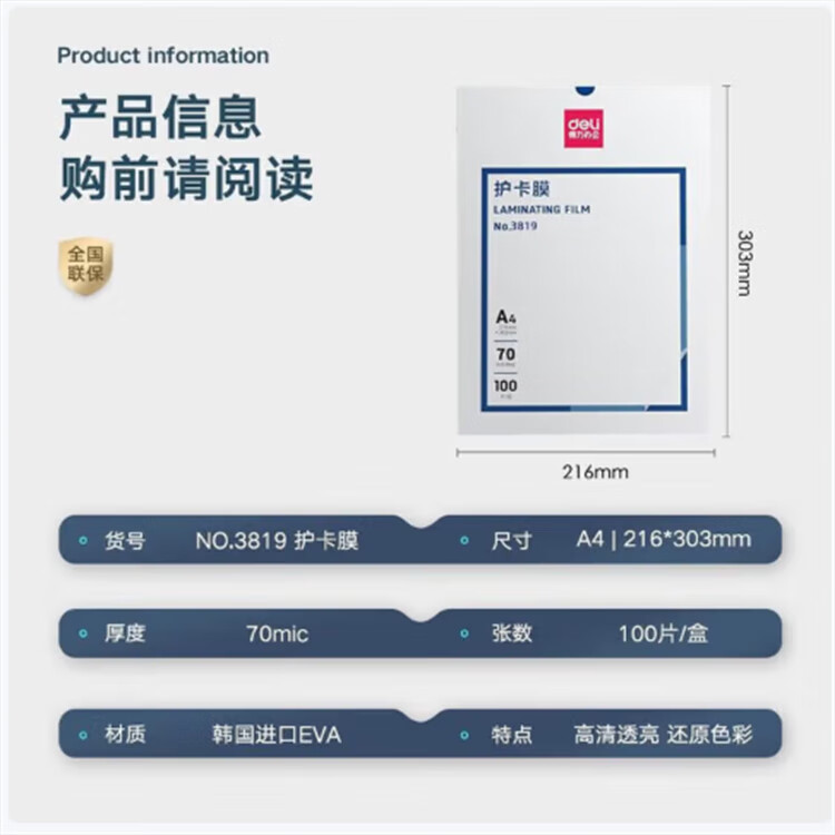 Deli (deli)deli 3819 plastic film A4 card protective film 7 wires 5 inches 95*135mm transparent 100 pieces/pack