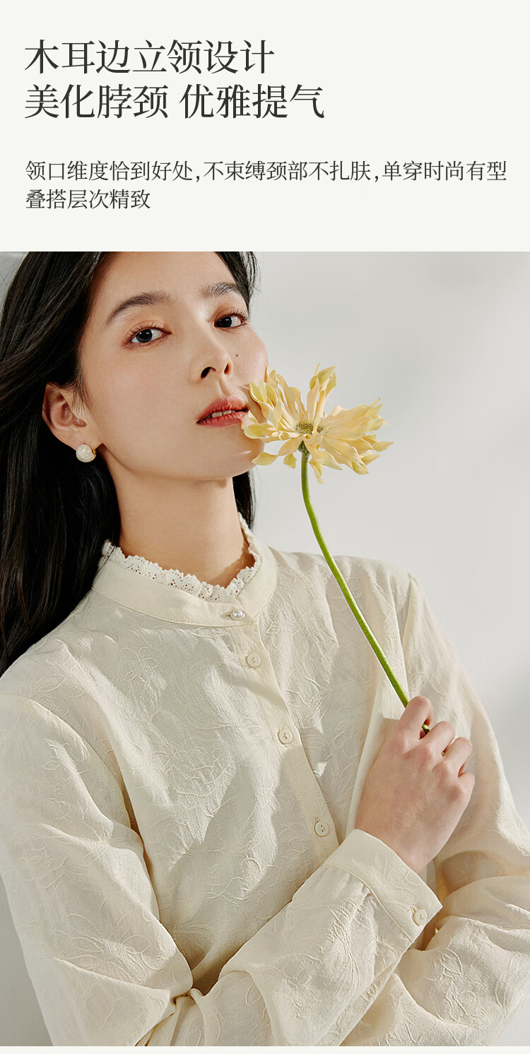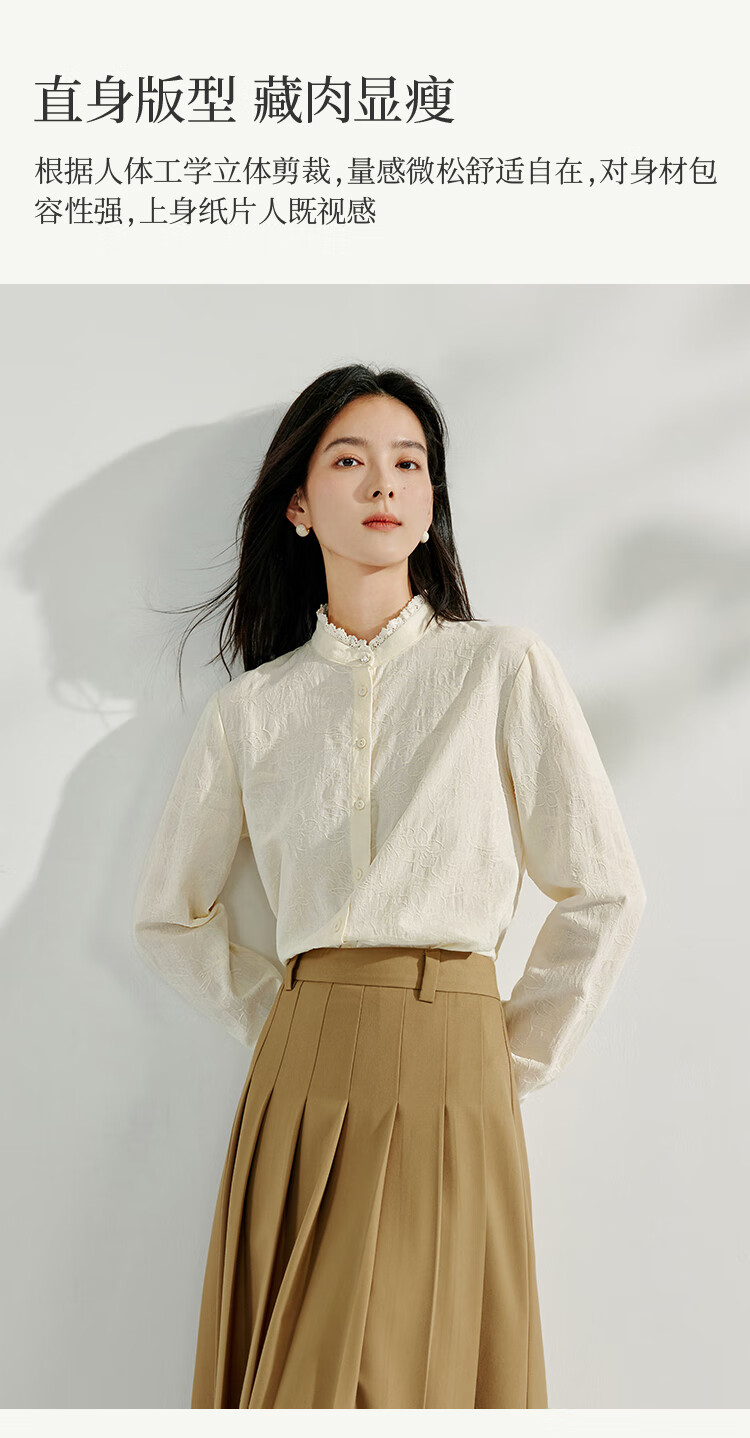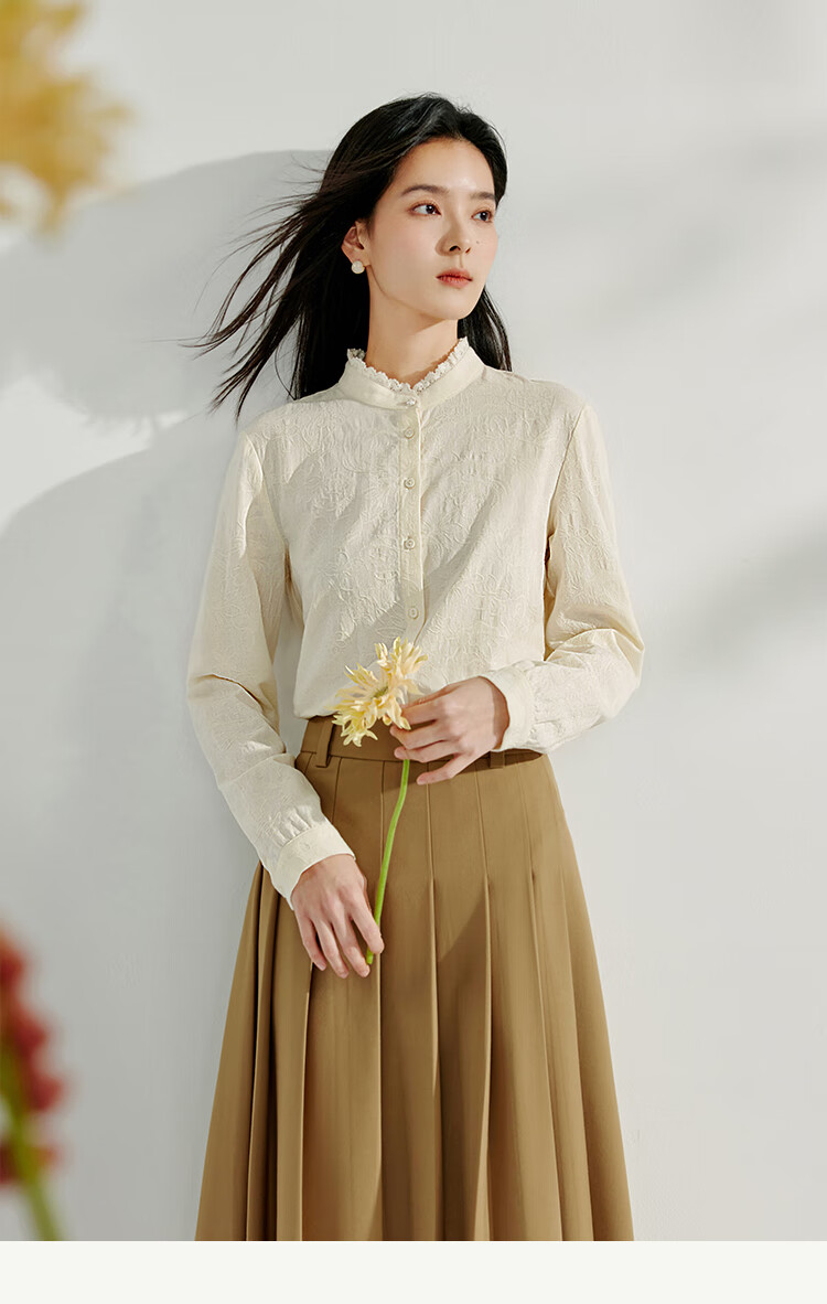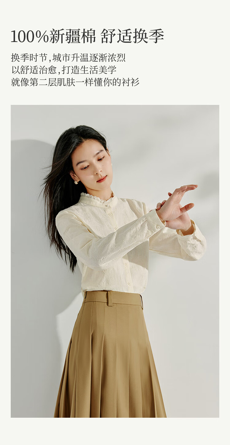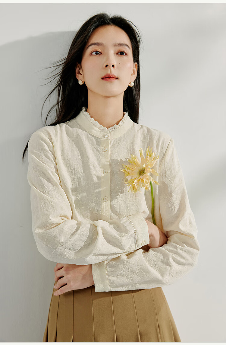 Inman cotton jacquard stand collar shirt spring women's casual commuting loose long-sleeved temperament shirt light apricot S