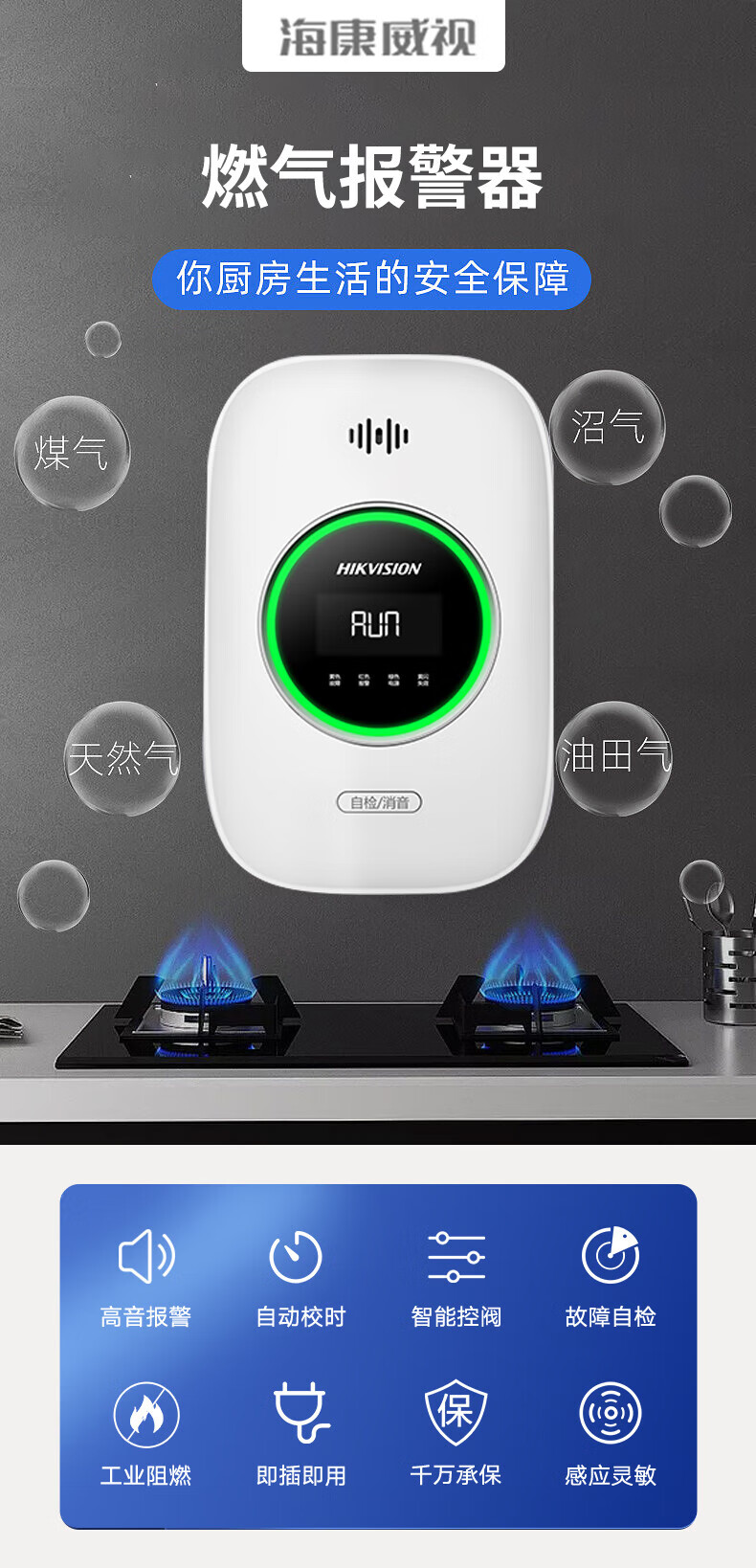 Hikvision gas alarm automatic cut-off natural gas leak detector methane CH4 combustible gas sensor restaurant kitchen commercial 3C certification JT-Q1T(S)