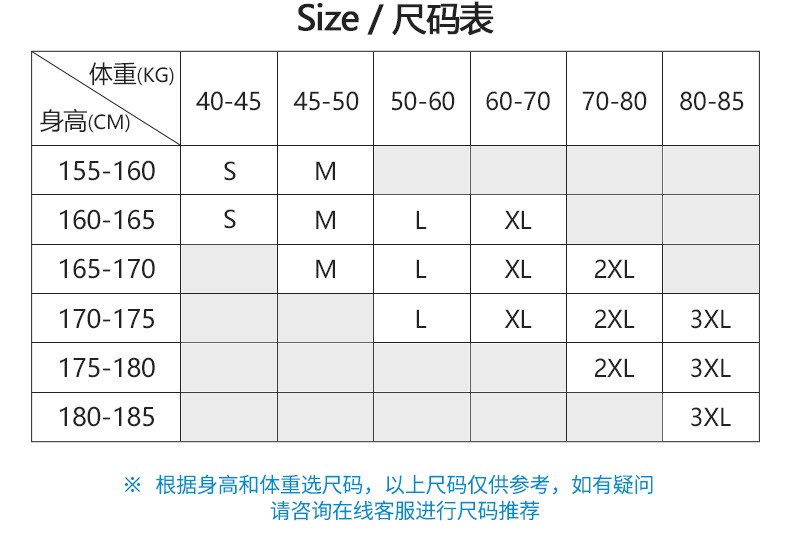 China (cm) 165 / 88-90 170 / 96-98 175 / 108-110 180 / 118-122 185 / 126-130