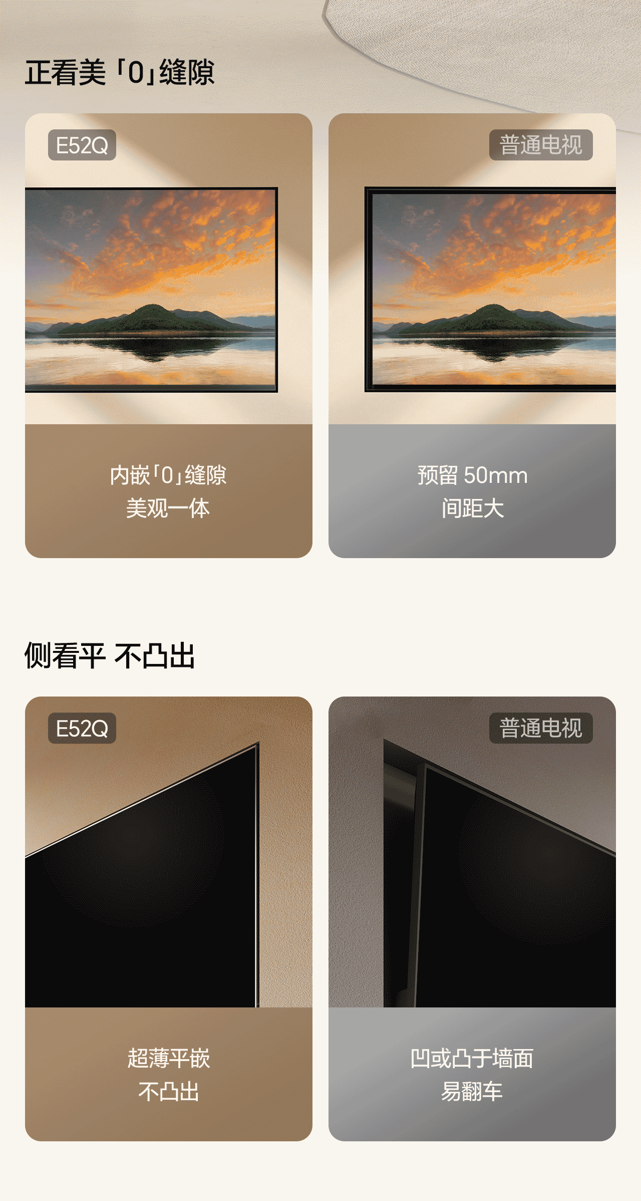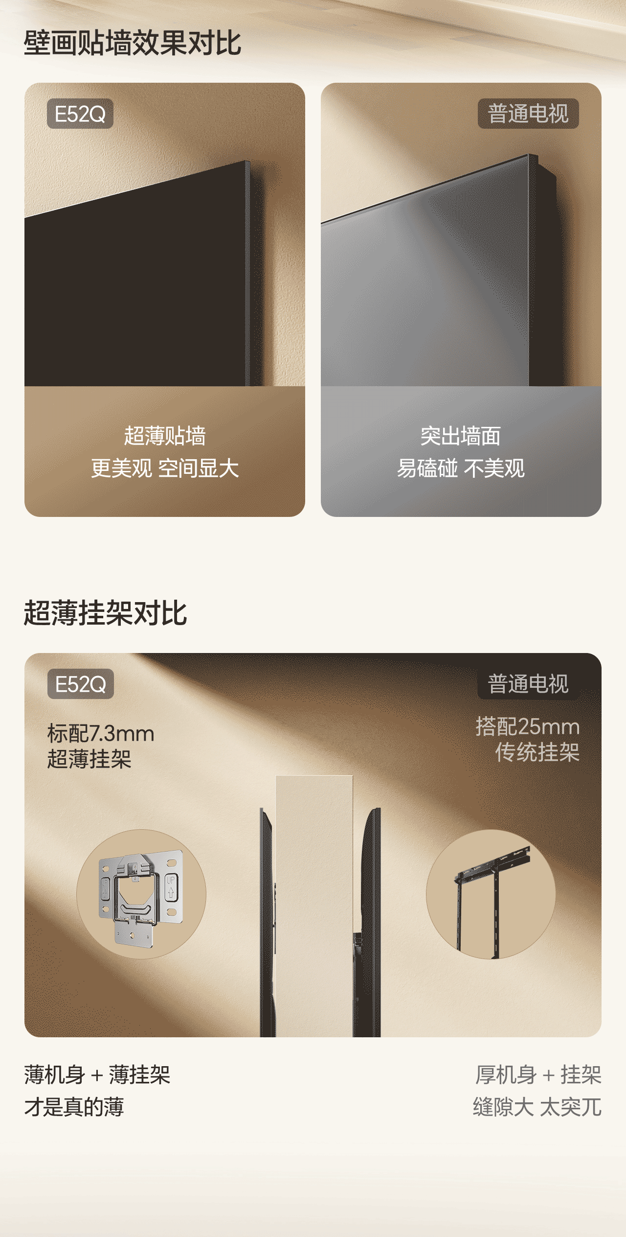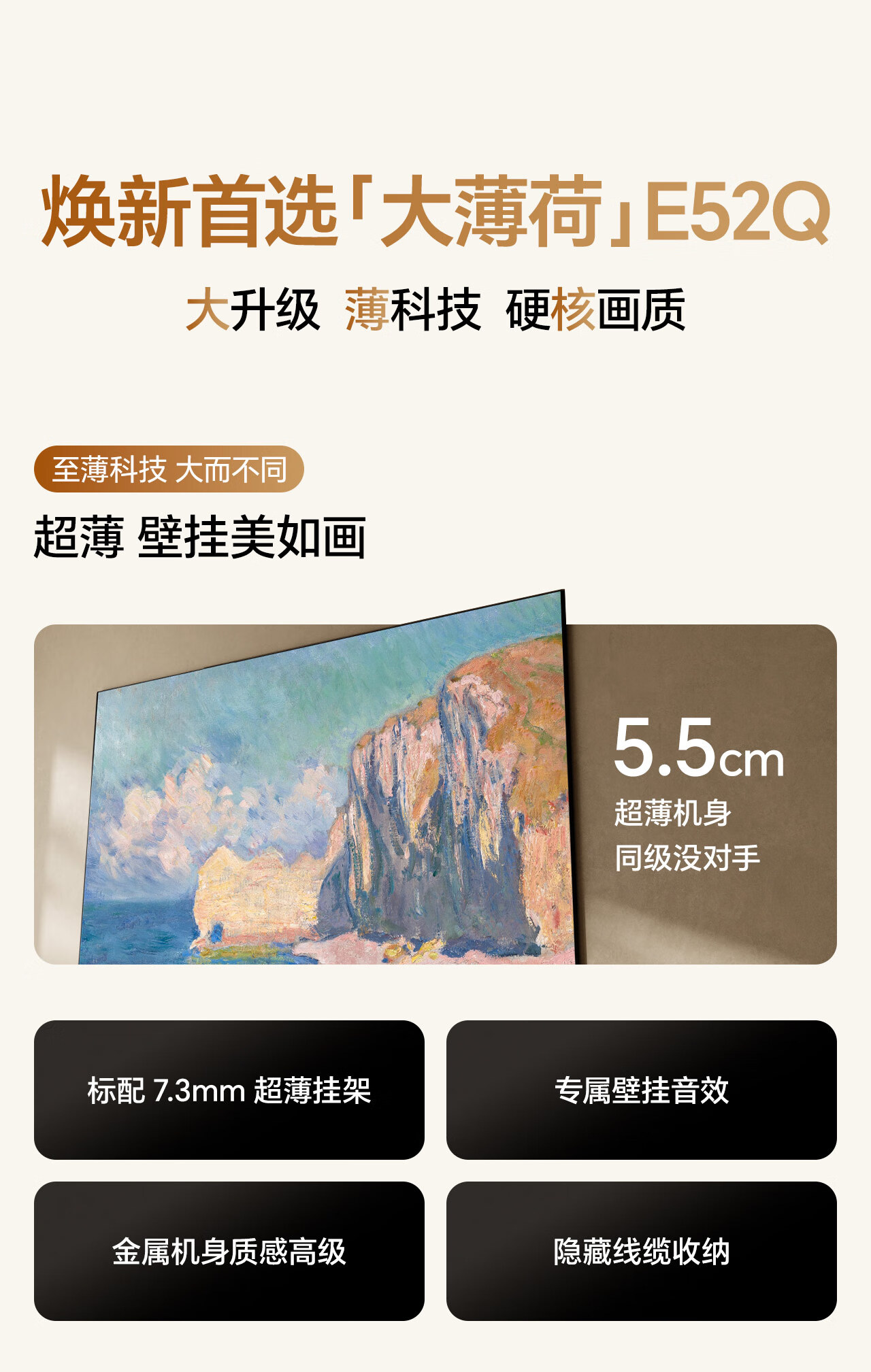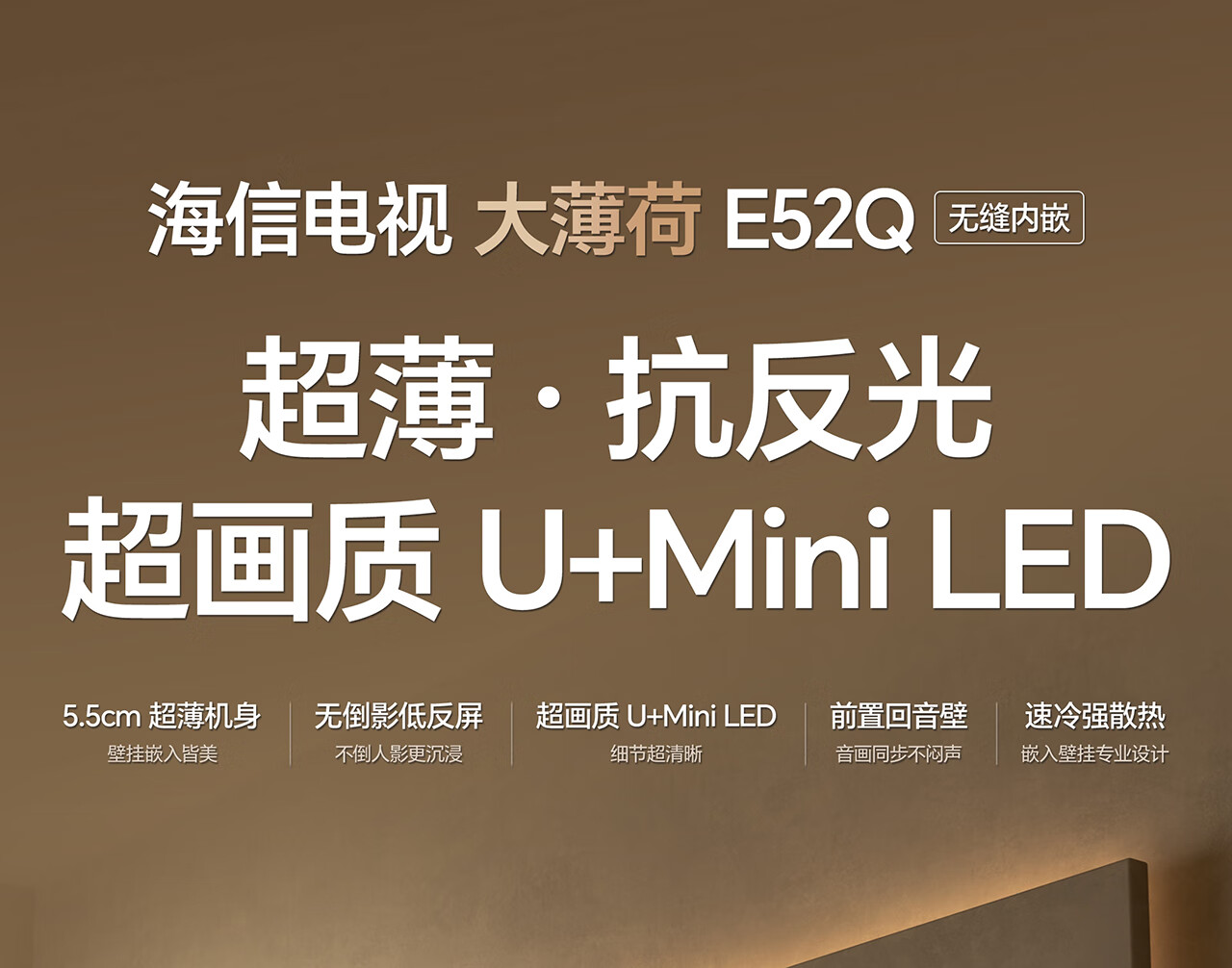 Hisense TV Big Mint E52Q 85 inches, ultra-thin wall-mounted, no reflection, low reflection screen, front sound bar, super picture quality U+MiniLED state-subsidized wallpaper TV 85E52Q