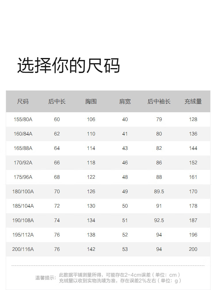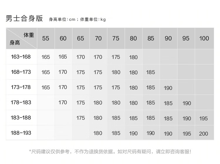 China (cm) 160-165/84-86 165-170 / 88-90 167-172 / 92-96 168-173 / 98-102 170-176 / 106-110