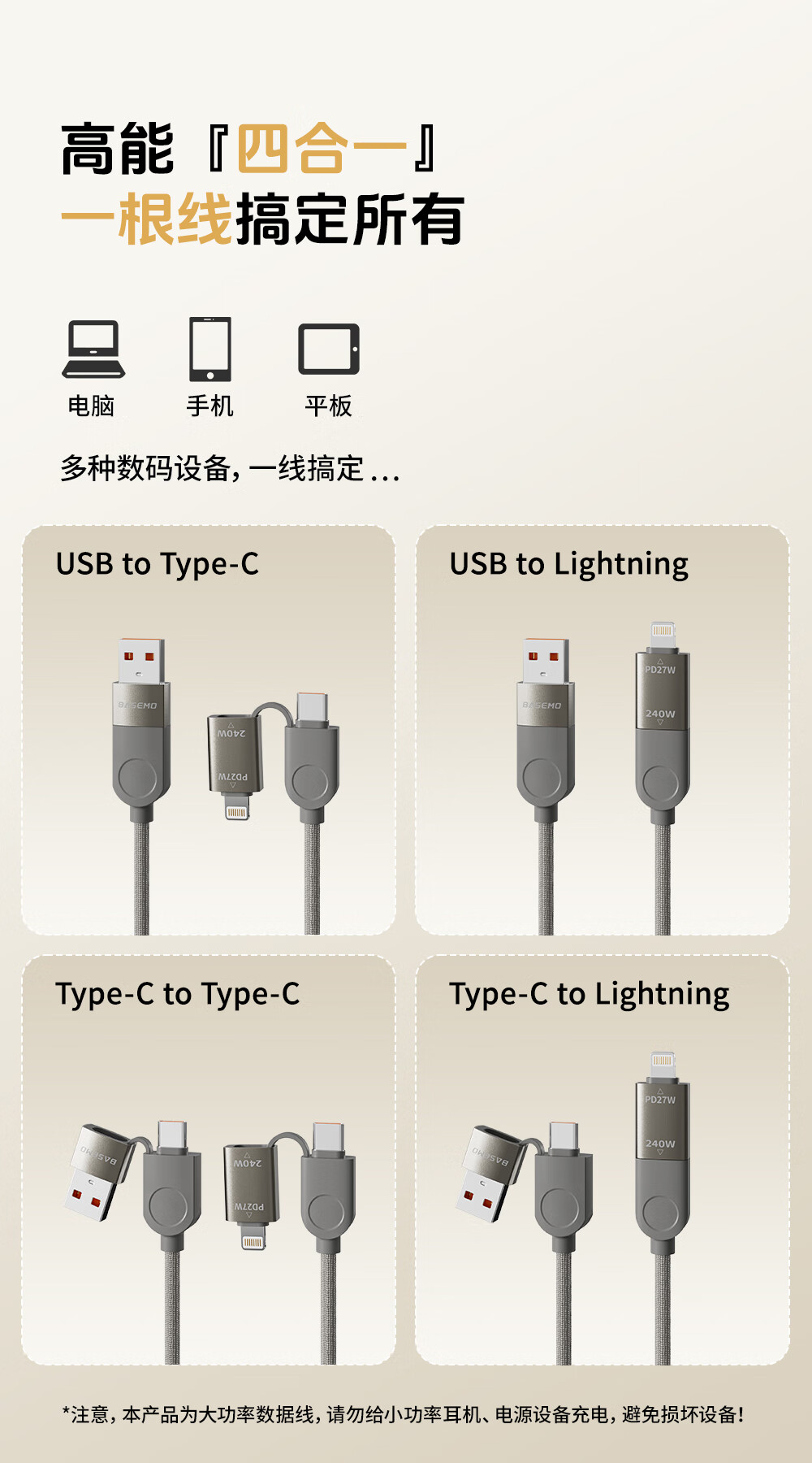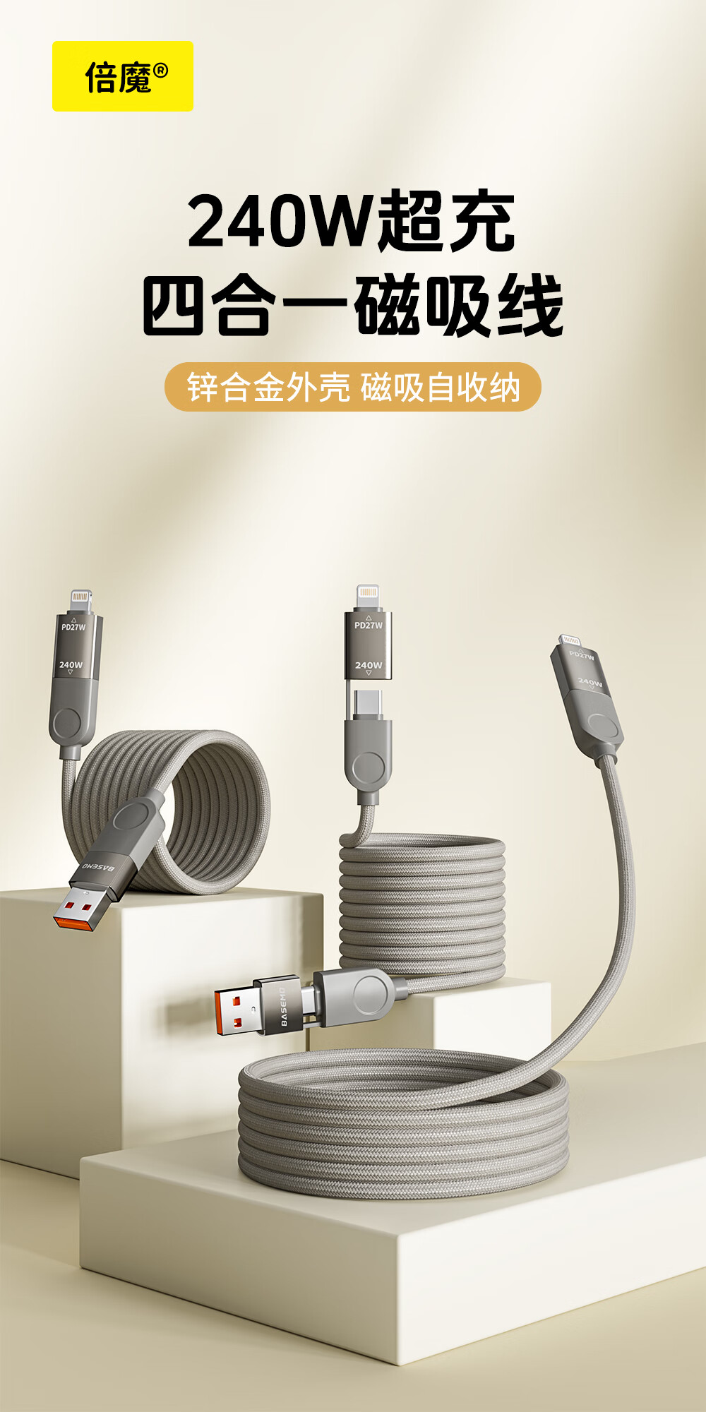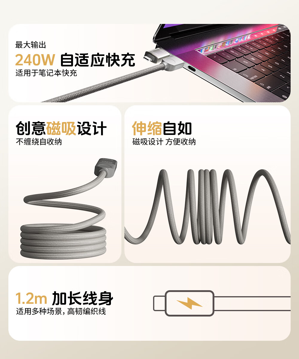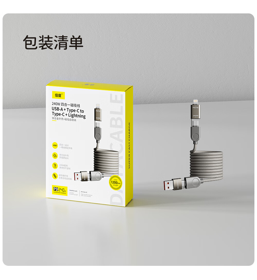 Bemo magnetic charging cable 240W power fast charging four-in-one data cable car data cable suitable for Apple 17/16/iPad/notebook/Huawei/Xiaomi 1.2m