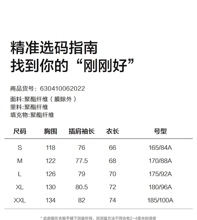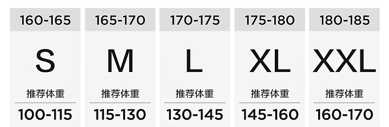 China (cm) 165 / 88-90 170 / 96-98 175 / 108-110 180 / 118-122 185 / 126-130
