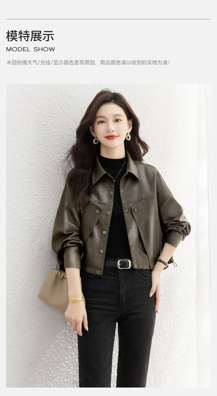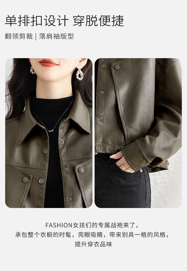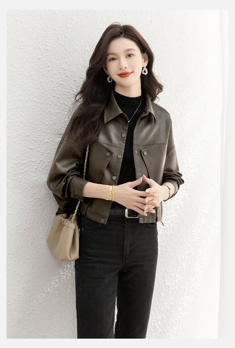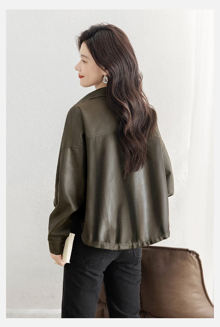 丝柏舍翻领长袖宽松外套女2025秋装新款复古气质短款简约皮衣