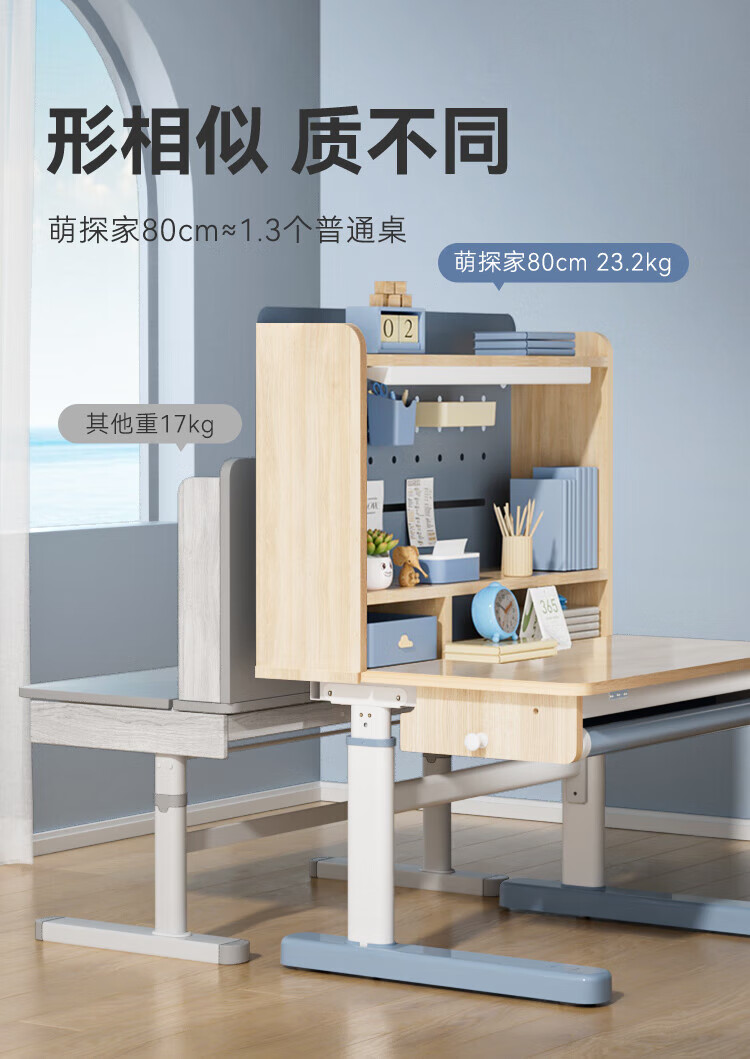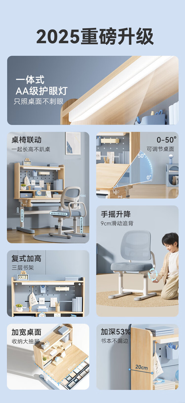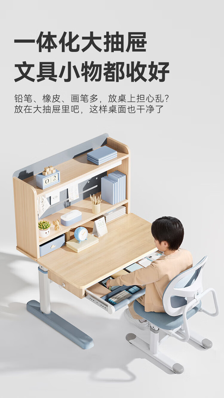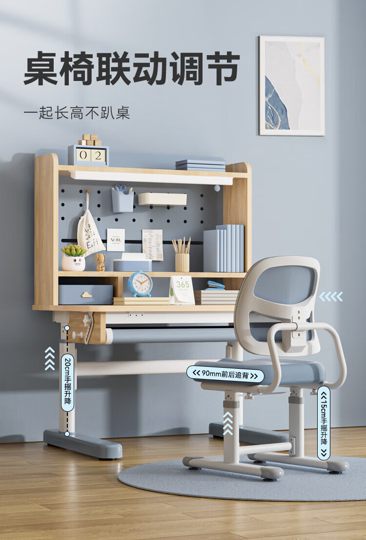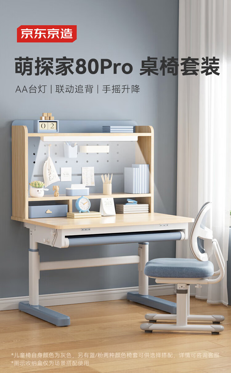 Jing Tokyo Made Cute Explorer Integrated Eye Protection Lamp Children's Study Table Desk and Chair Set Lifting Student Writing Desk and Chair 80cm Blue