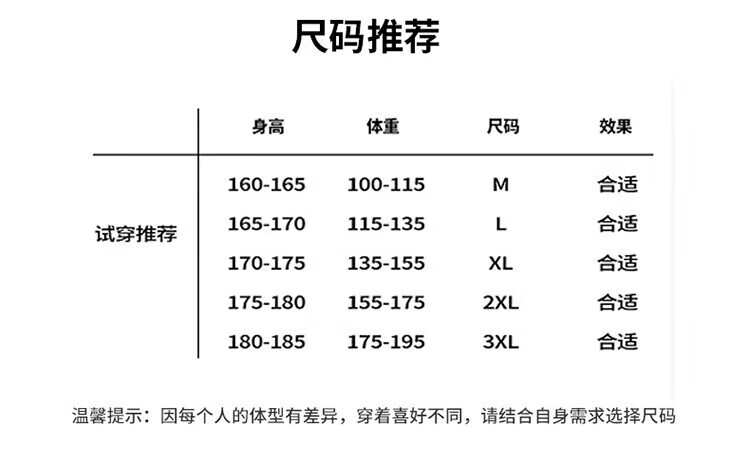China (cm) 165 / 88-90 170 / 96-98 175 / 108-110 180 / 118-122 185 / 126-130