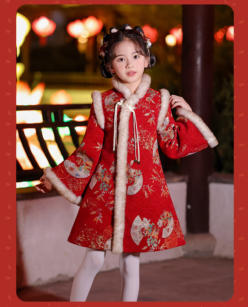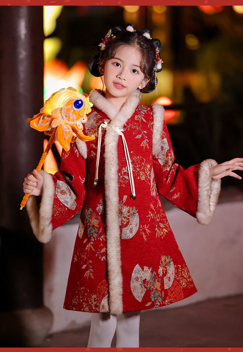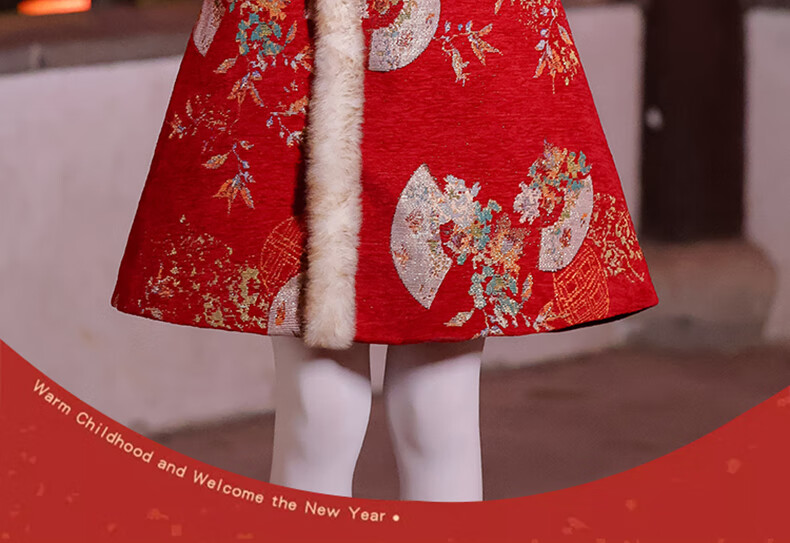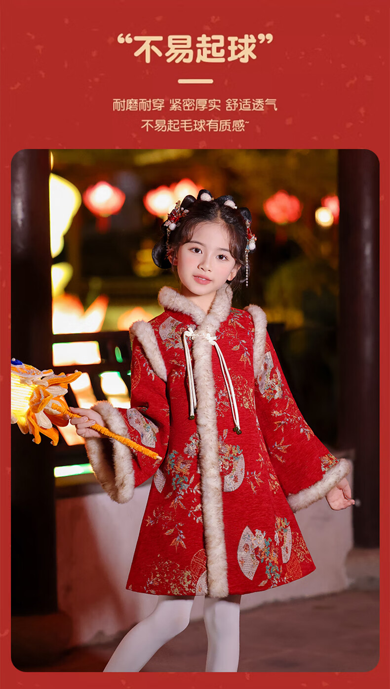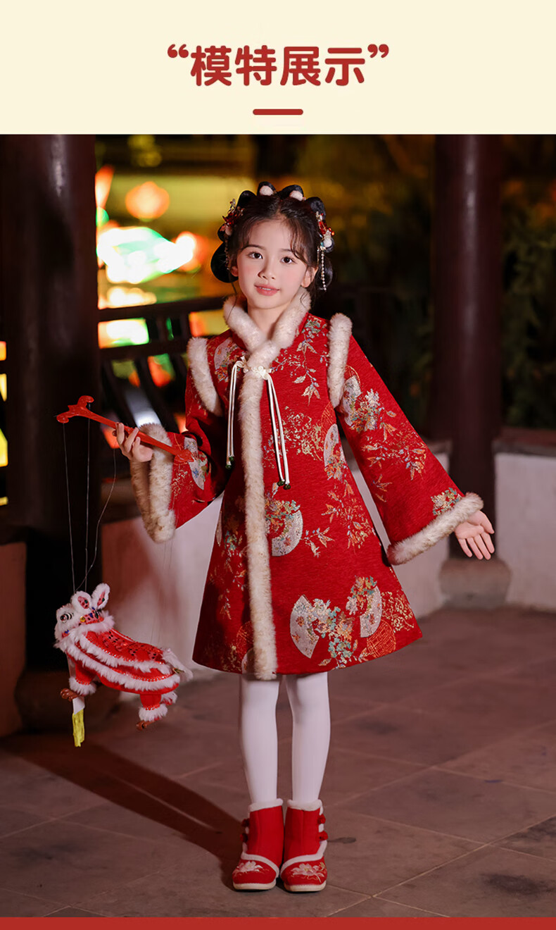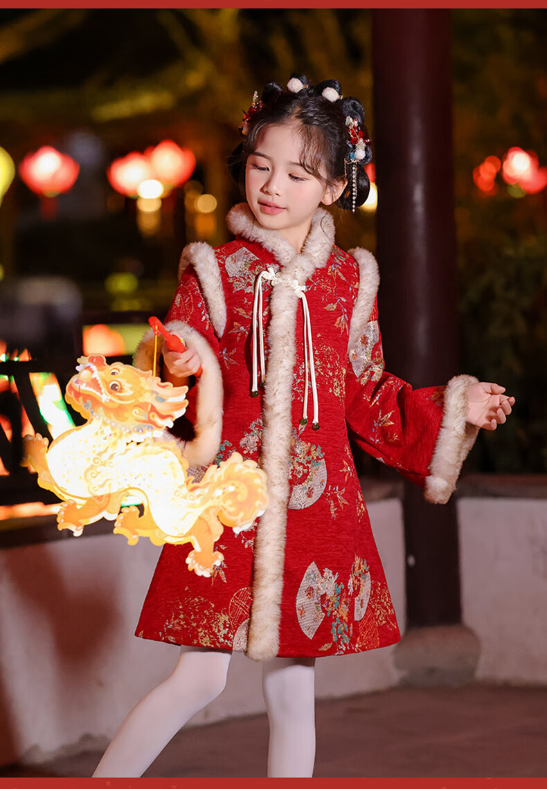 Anneyol Girls' Cheongsam New Year's Eve Costume Winter Chinese Style Children's New Year Hanfu Skirt Thickened Winter Style Red 130