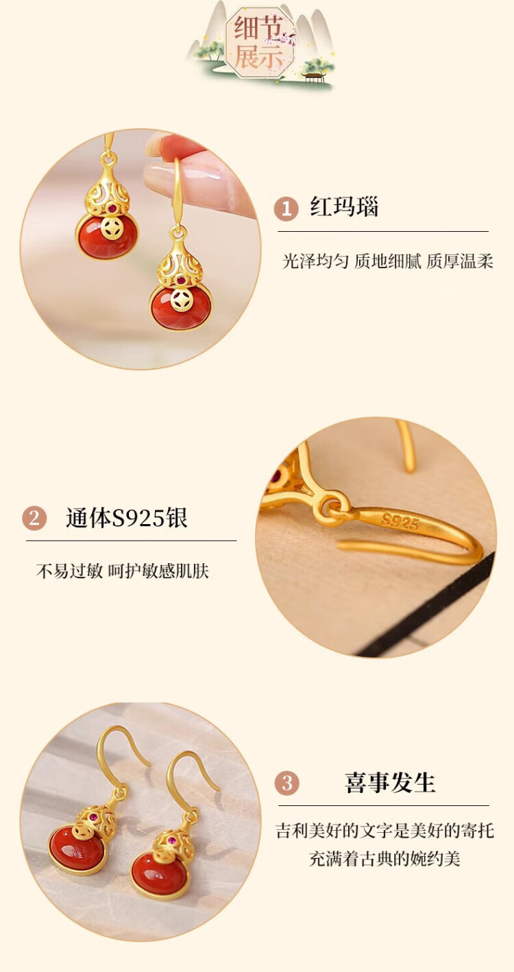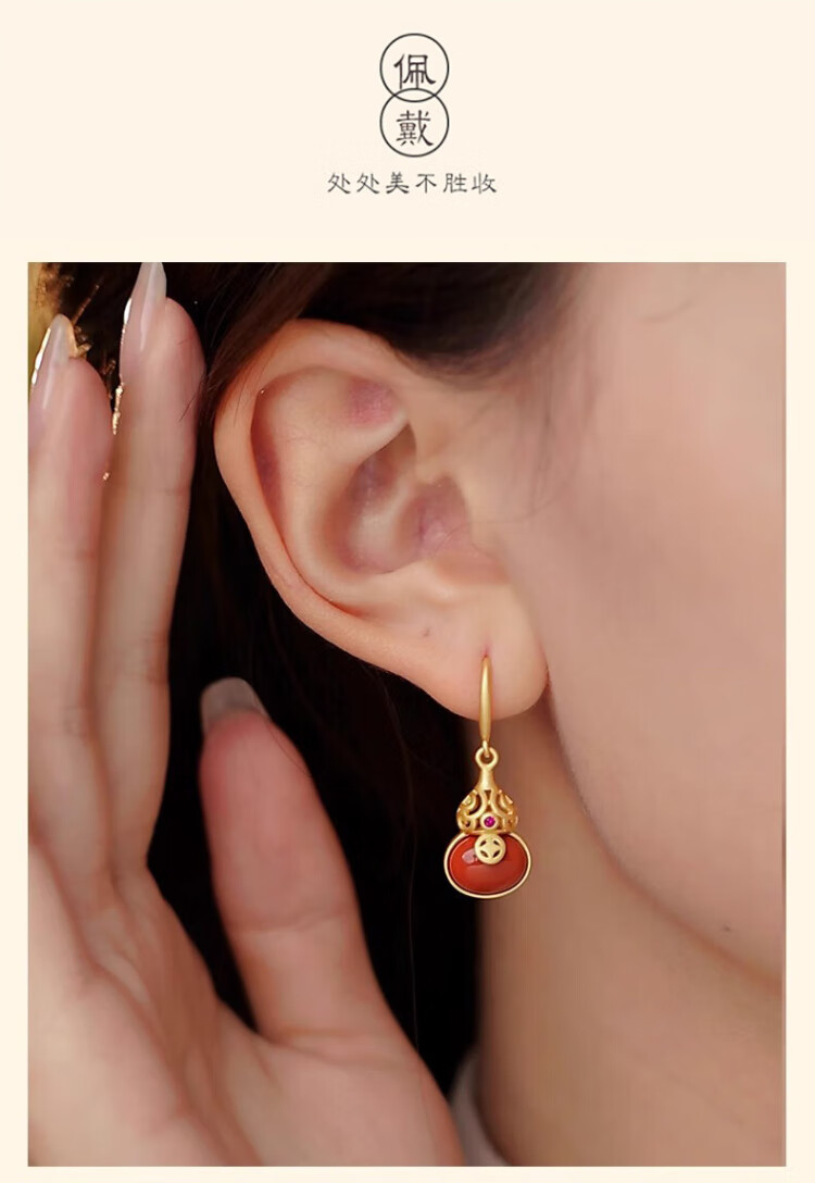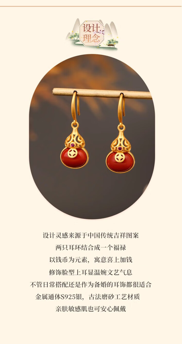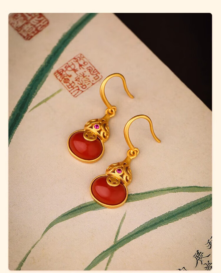 Little Silversmith S925 silver gourd earrings for women agate small gourd copper coin earrings new Chinese style hollow tassel earrings girlfriend gift