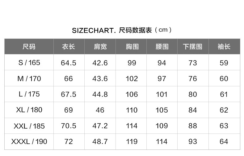 China (cm) 165 / 88-90 170 / 96-98 175 / 108-110 180 / 118-122 185 / 126-130