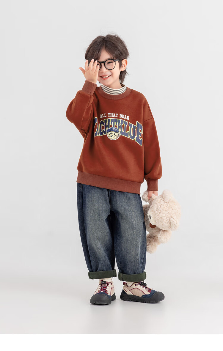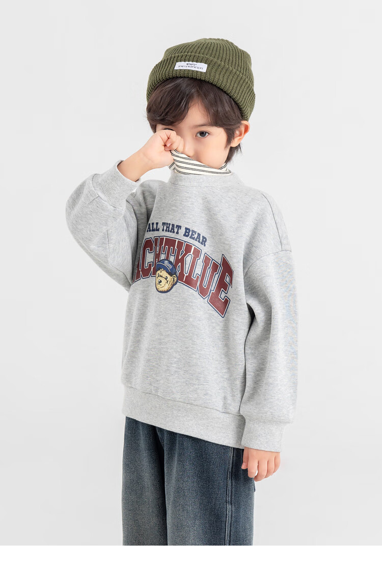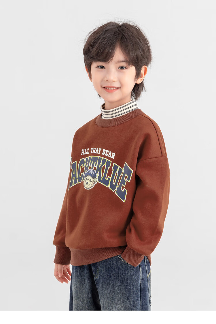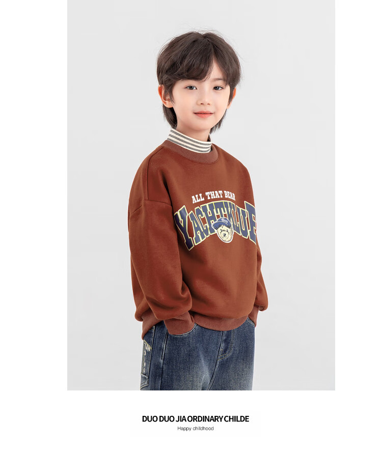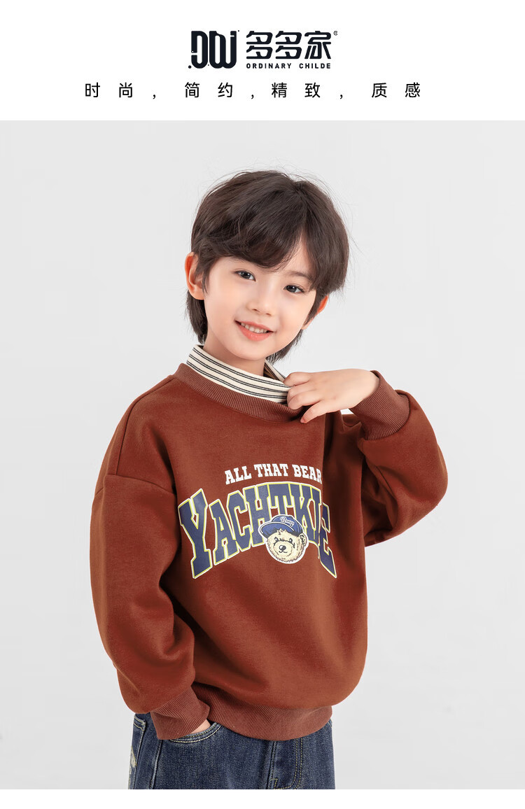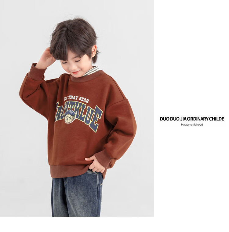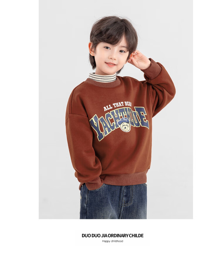 Duojia Bear Print Fake Two-piece Boys' Sweaters Winter Warm and Velvet Bottoming Children's Casual Sports Tops Trendy