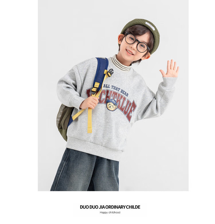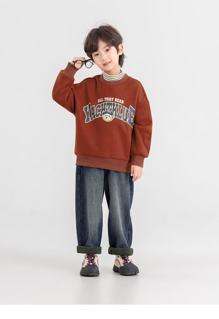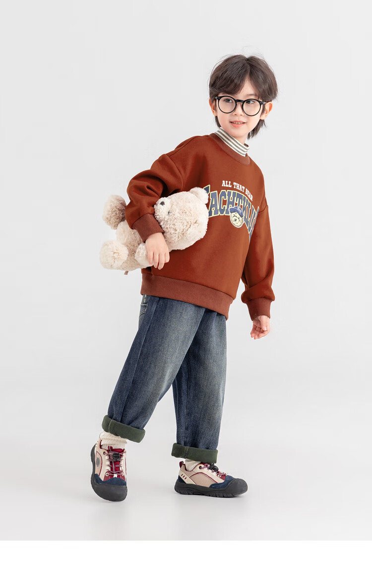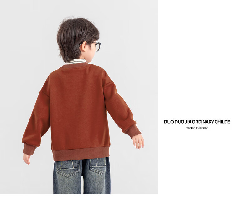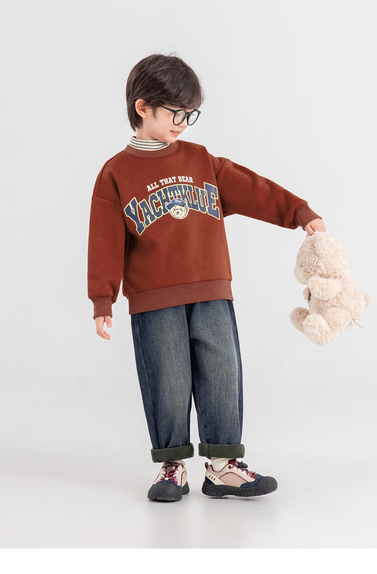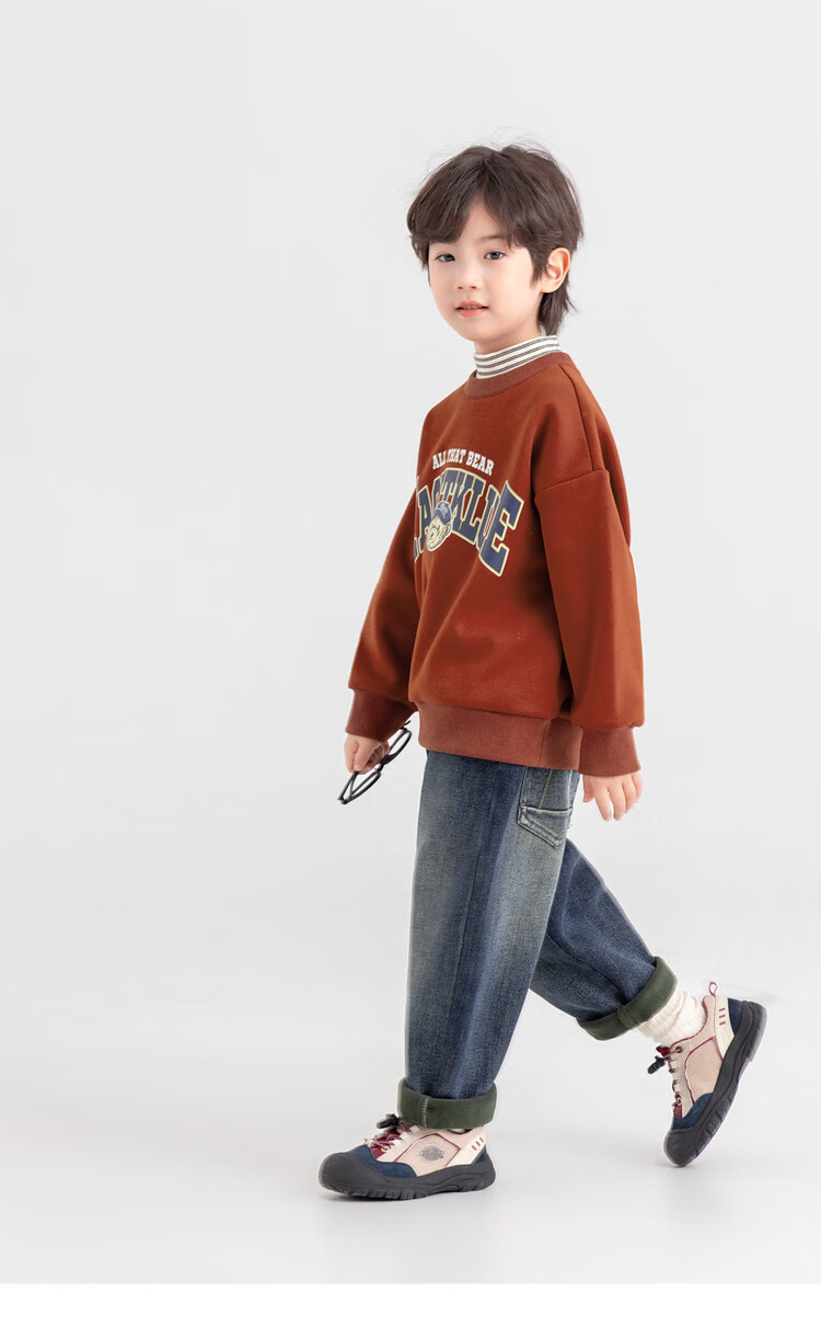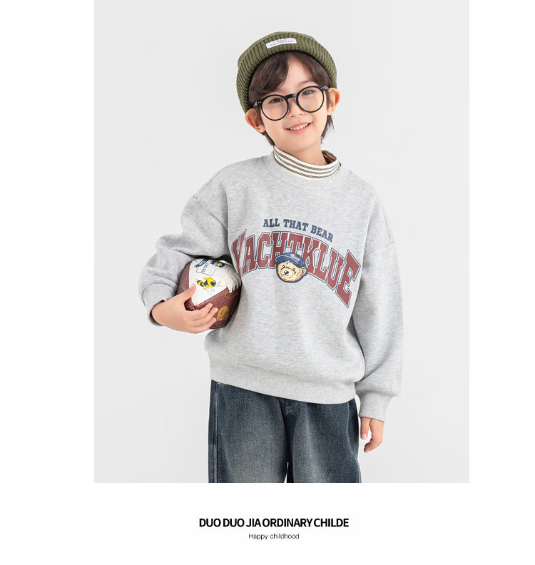 Duojia Bear Print Fake Two-piece Boys' Sweaters Winter Warm and Velvet Bottoming Children's Casual Sports Tops Trendy