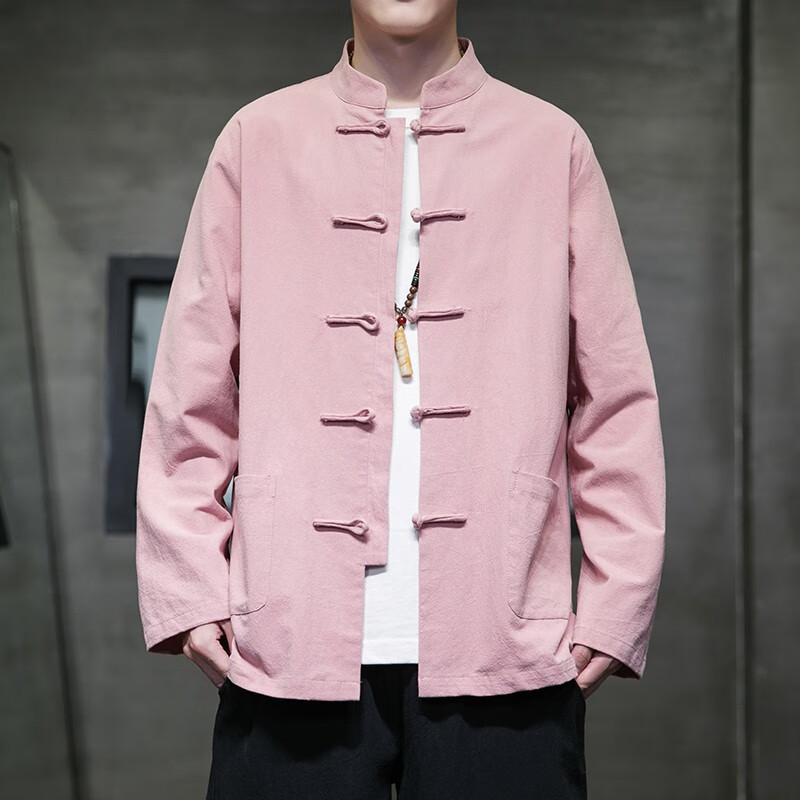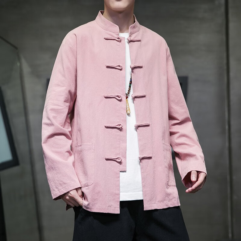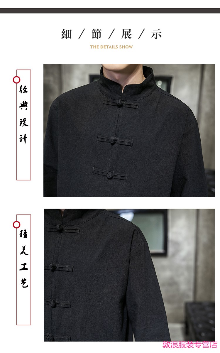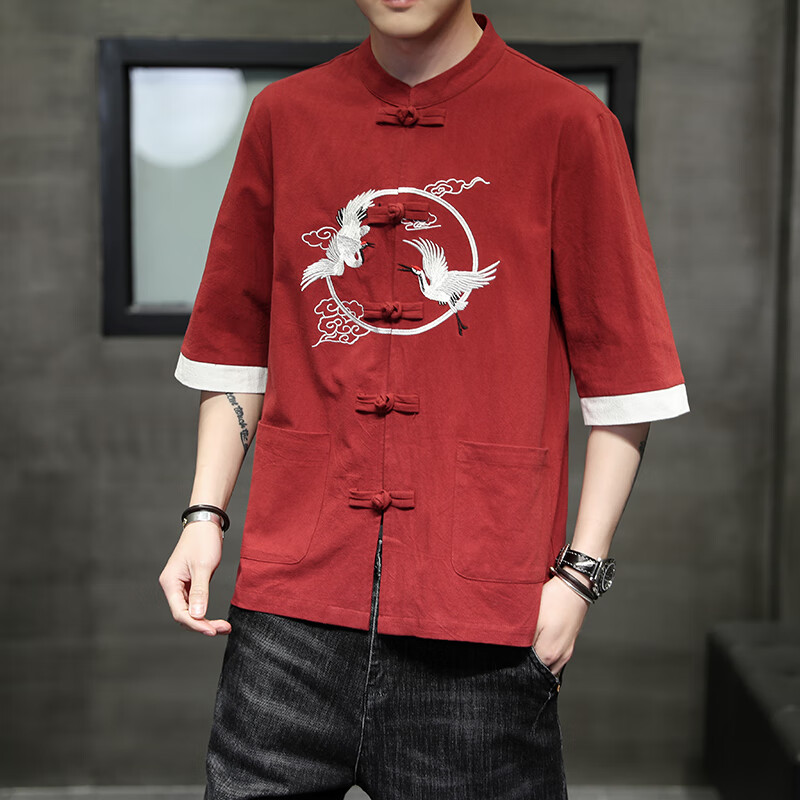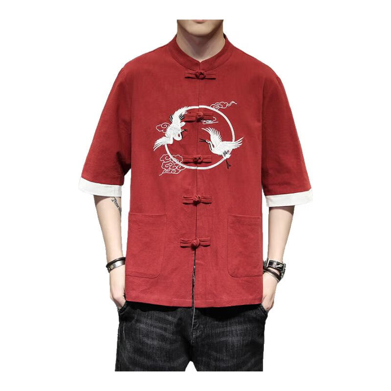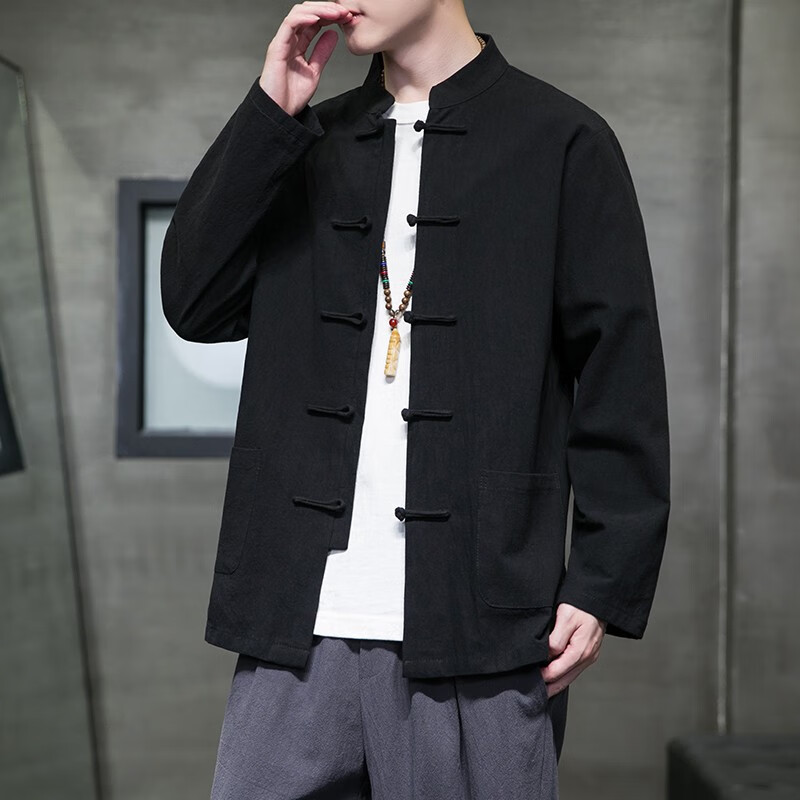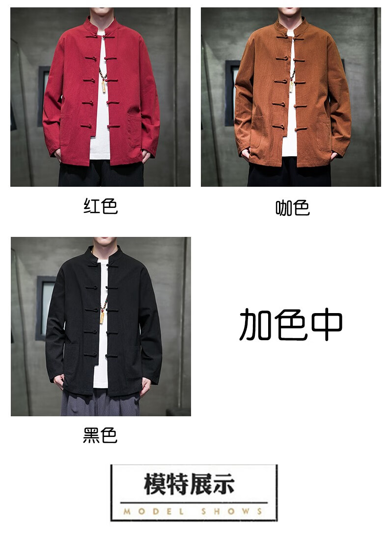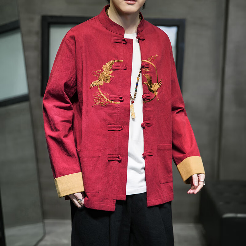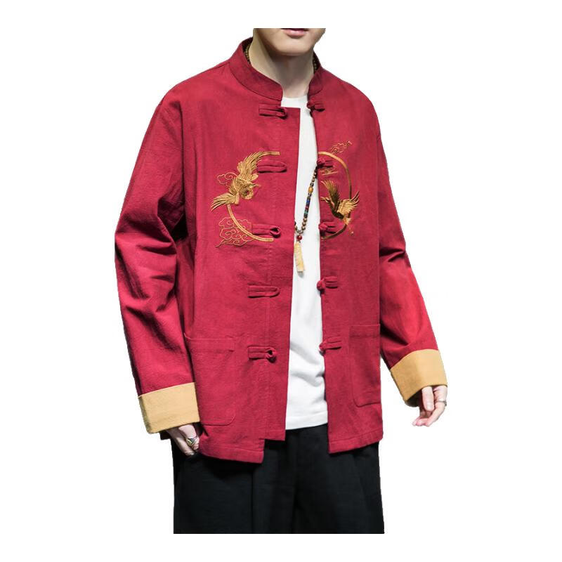 Huatianmu large size Chinese style shirt men's stand collar long sleeve retro style tunic tunic cotton and linen plate button spring and autumn jacket burgundy 3XL, recommended 150-170Jin Jin equals 0.5 kg