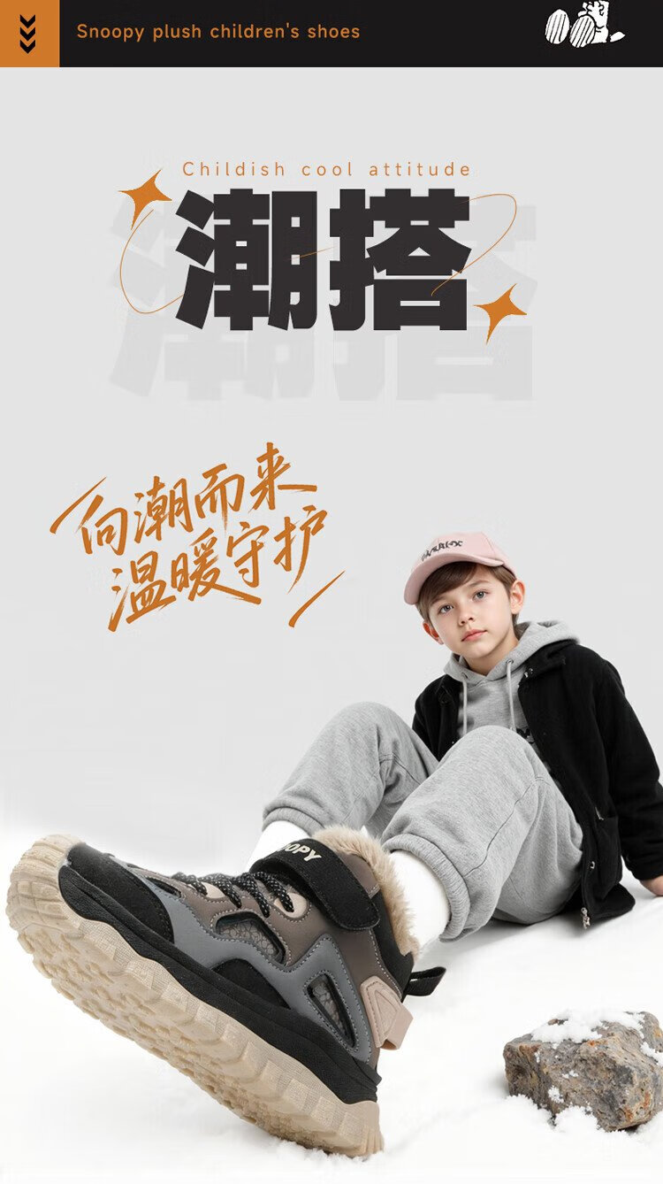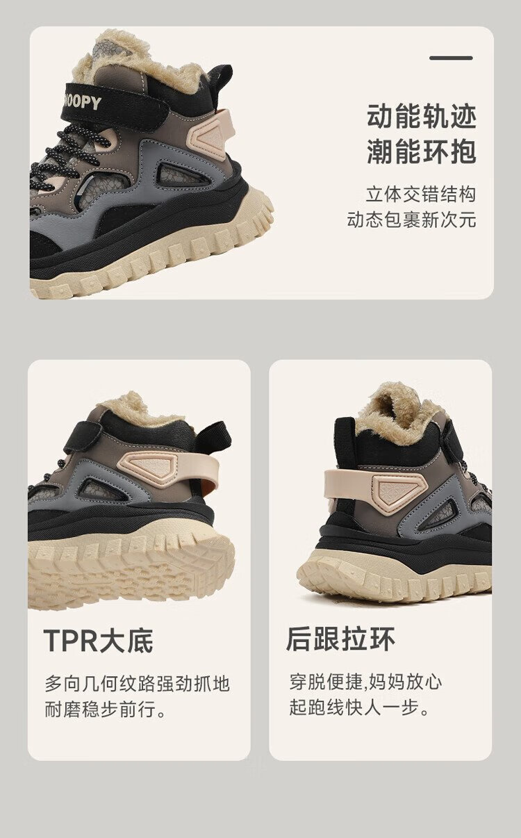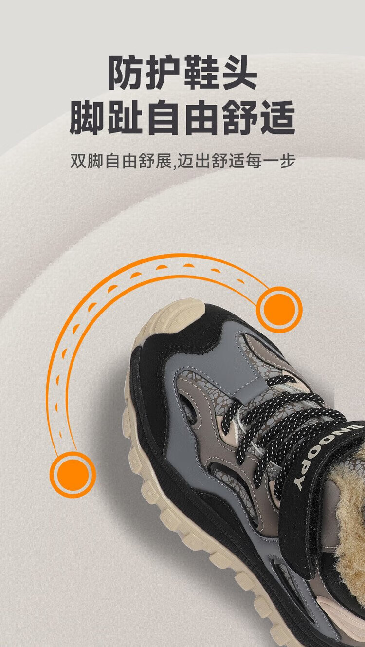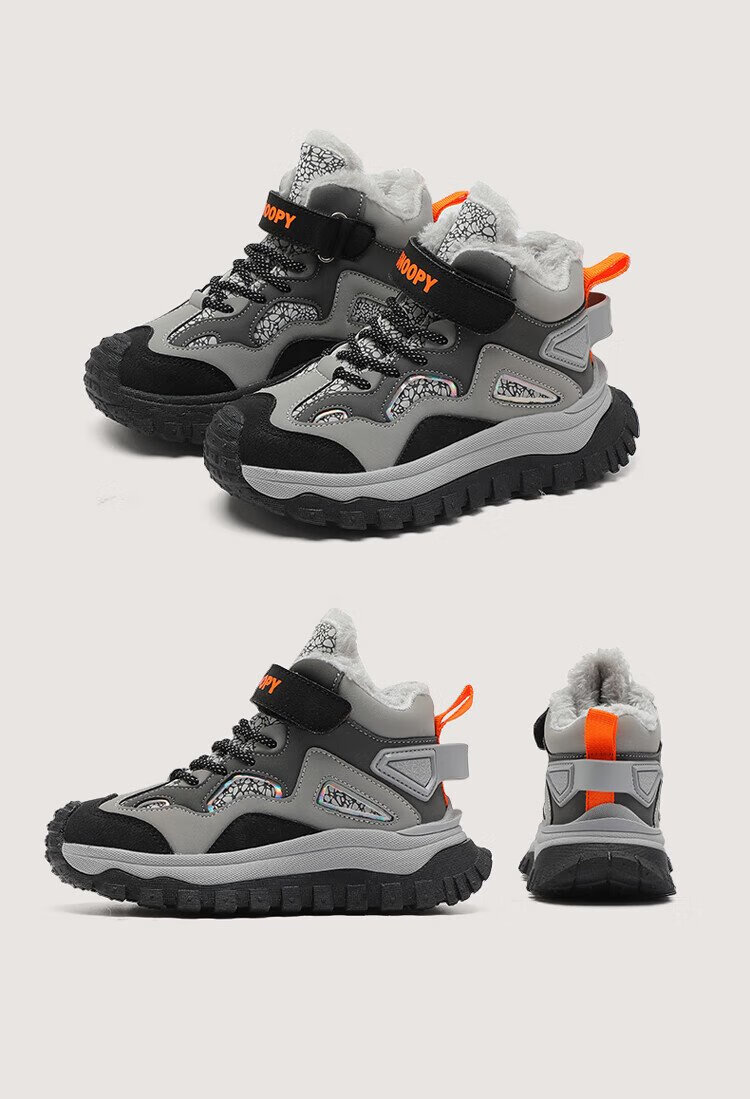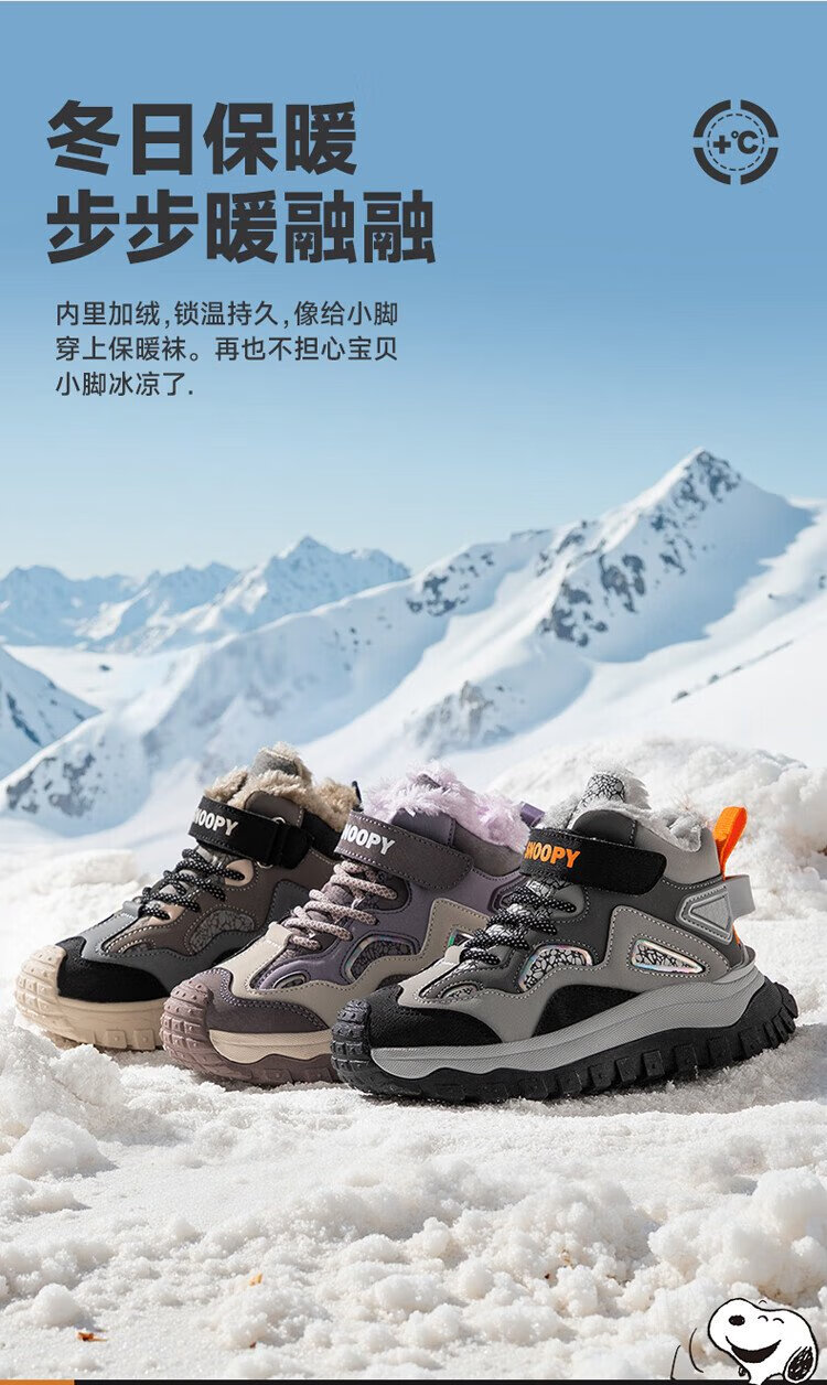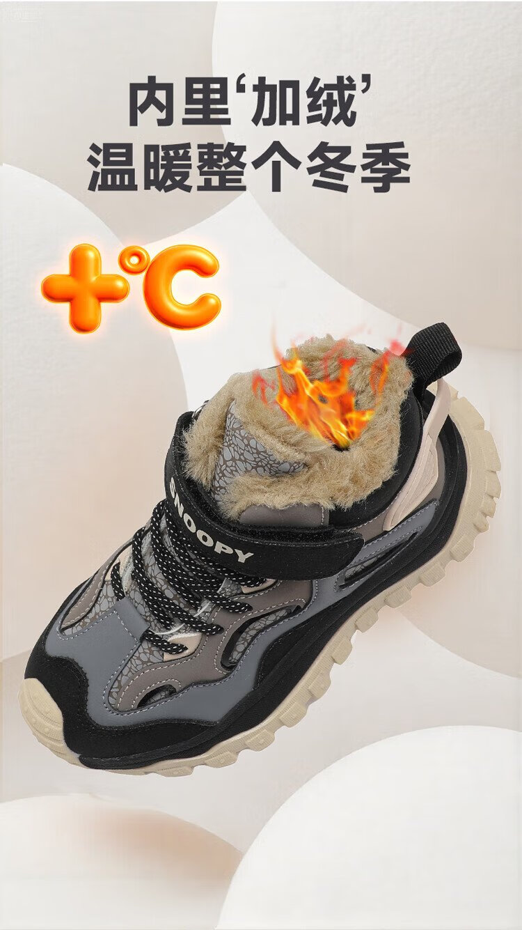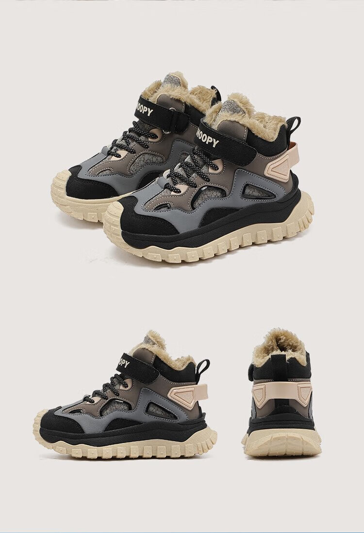 SNOOPY Snoopy children's shoes children's cotton shoes winter plus velvet warm sports shoes boys and girls outdoor shoes 3908 dark gray rice 35