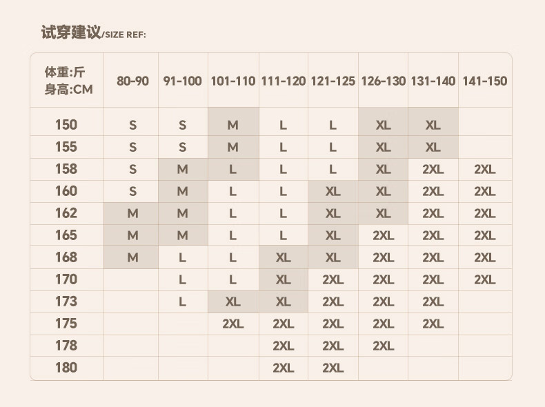 China (cm) 160-165/84-86 165-170 / 88-90 167-172 / 92-96 168-173 / 98-102 170-176 / 106-110