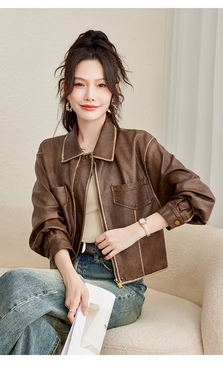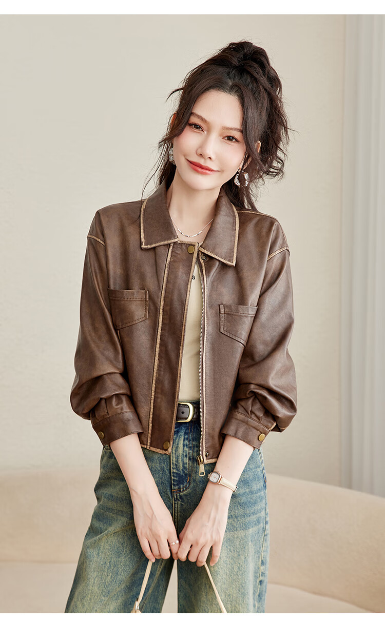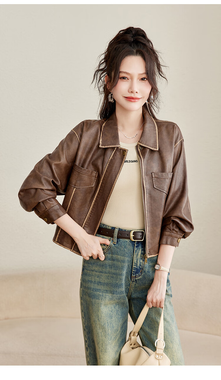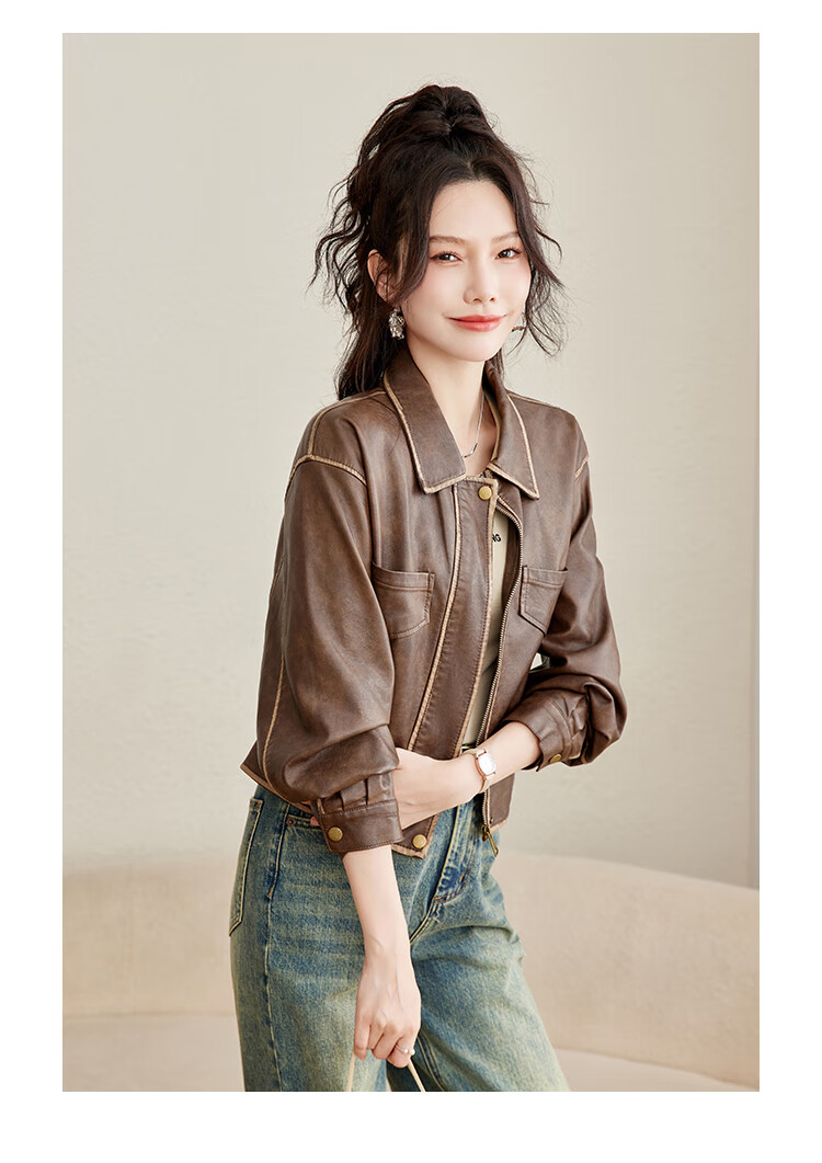 TERRE BLEUE Fashion Autumn Clothing 25 New Retro Motorcycle Leather Jacket Lapel Loose Sweet Cool Maillard Cardigan Jacket